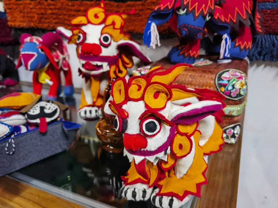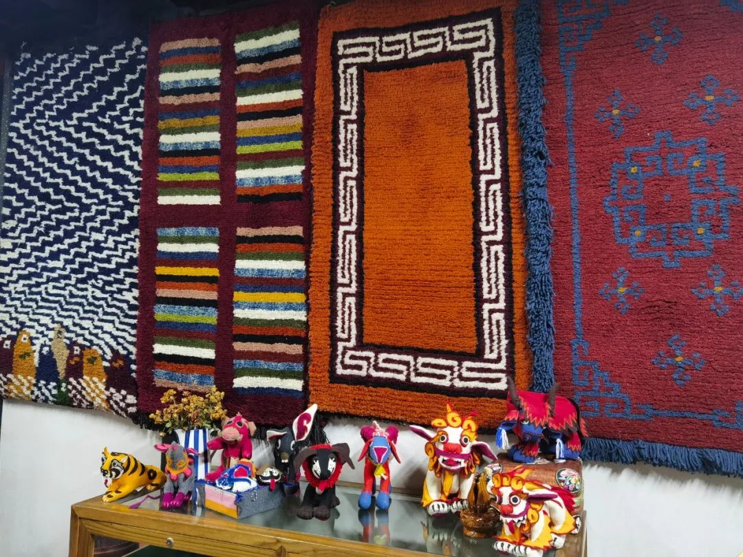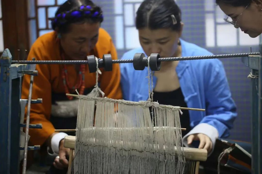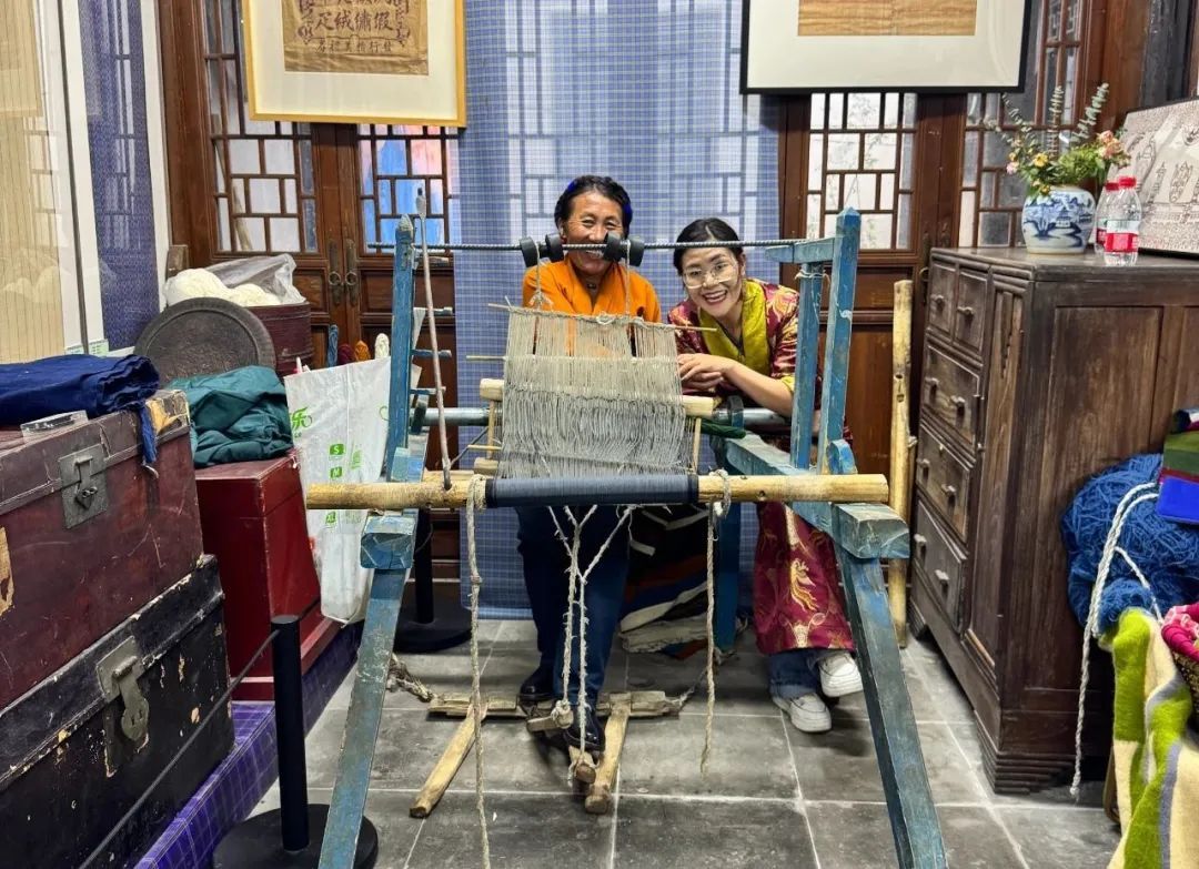 当天,松江布展示馆一改往日蓝色印花布的江南风格,墙壁上挂着一张张五颜六色的氆氇挂毯,桌子上摆着极具藏族风情的十二生肖布艺作品。在手工织机旁,一身藏袍的次仁卓嘎正手把手地带着市民体验编织过程。
