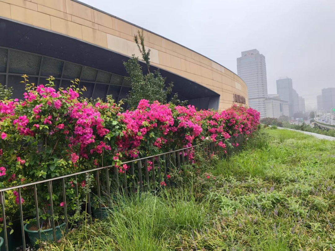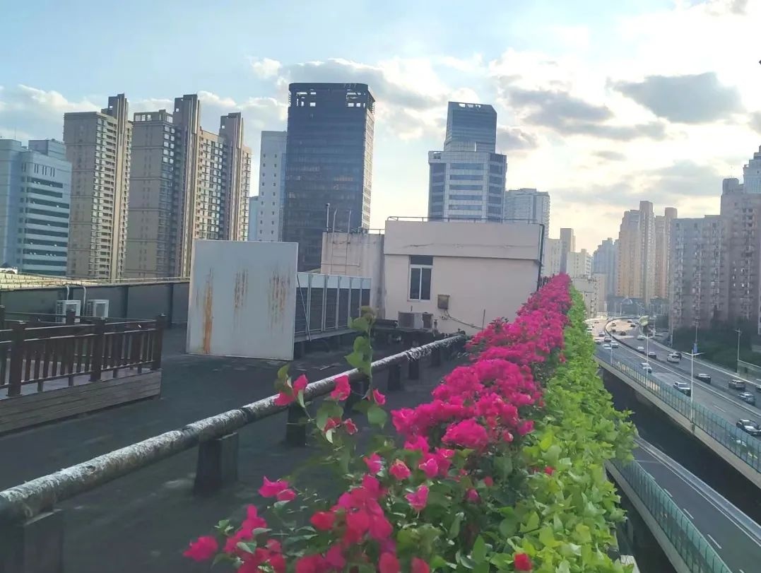 另外,风铃广场改造提升以“蓝绿飘带”为概念,将“绿色”宿根植被与蓝色水岸相互交织,串联起一条舒适、有亮点、低维护的宜居滨河走廊;延虹绿地搭配园内核心景观“花树”,种植各色花境,烘托出百花齐放的氛围;虹桥体育公园结合运动小品,种植流线型花带,红黄花卉相间进一步突出雕塑的动态感;镜花园在入园处种植红色、紫色、玫红等色彩缤纷的花朵,用以烘托节日气氛;从点到线,对延安高架两侧沿线建筑檐口进行了花卉布置,形成城市空中彩化景观带。除了延安西路沿线,区绿化管理部门还对长宁路沿线进行了檐口和屋顶绿化的改造提升,延安西路高架沿线檐口花卉共计布置三角梅约4000盆,辅以金叶甘署、常春藤等植物,丰富了沿线景观颜色和品种。