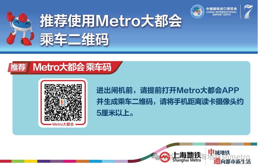 为避免观展乘客集中离场后排队购票,展会期间,建议参展乘客在进站前购买好返程车票、一日票或优先下载“Metro大都会”APP直接刷二维码乘坐上海地铁。