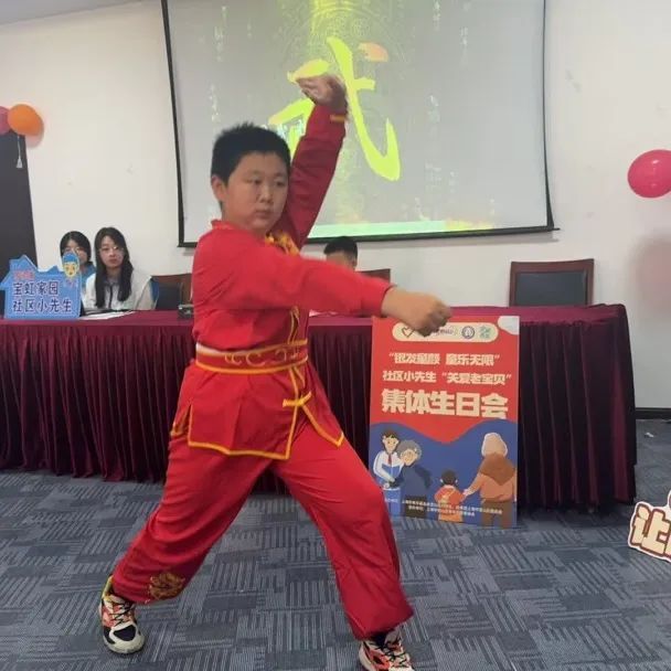 此外,舞蹈、武术、吉他弹唱、朗诵以及歌曲串烧等一系列丰富多彩的节目轮番上演。“社区小先生”们纷纷登台亮相,他们满怀激情地演绎着自己的特长,将满腔的热情毫无保留地挥洒在舞台上,为台下的寿星们带去了最直接、最真挚的陪伴与欢乐。