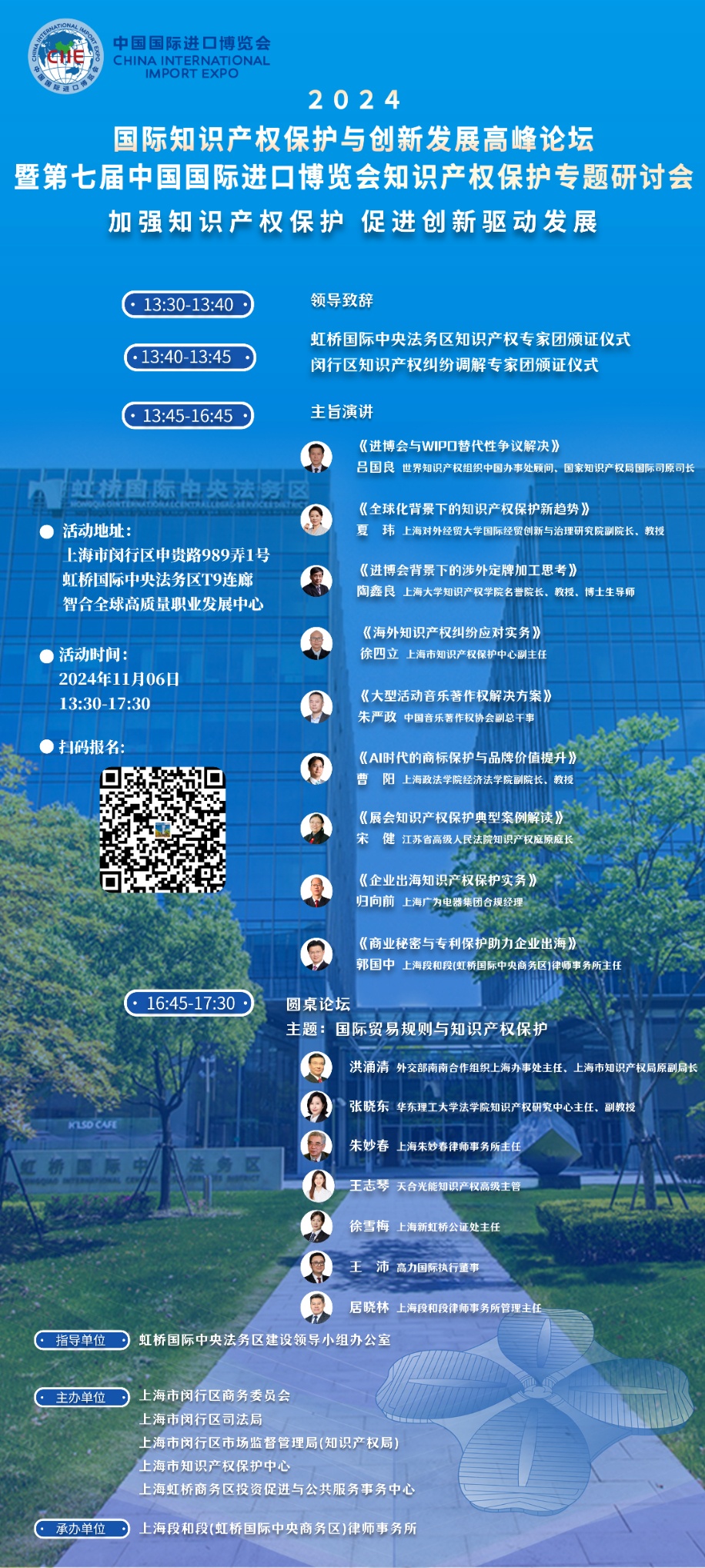 随着中企出海的热潮和发展新质生产力的大趋势,知识产权保护的重要性日益凸显。在第七届中国国际进口博览会召开之际,举办此次高规格的国际知识产权论坛,旨在搭建一个高层次的国际交流平台,共同探讨全球化背景下知识产权保护的新趋势、新挑战和新对策。