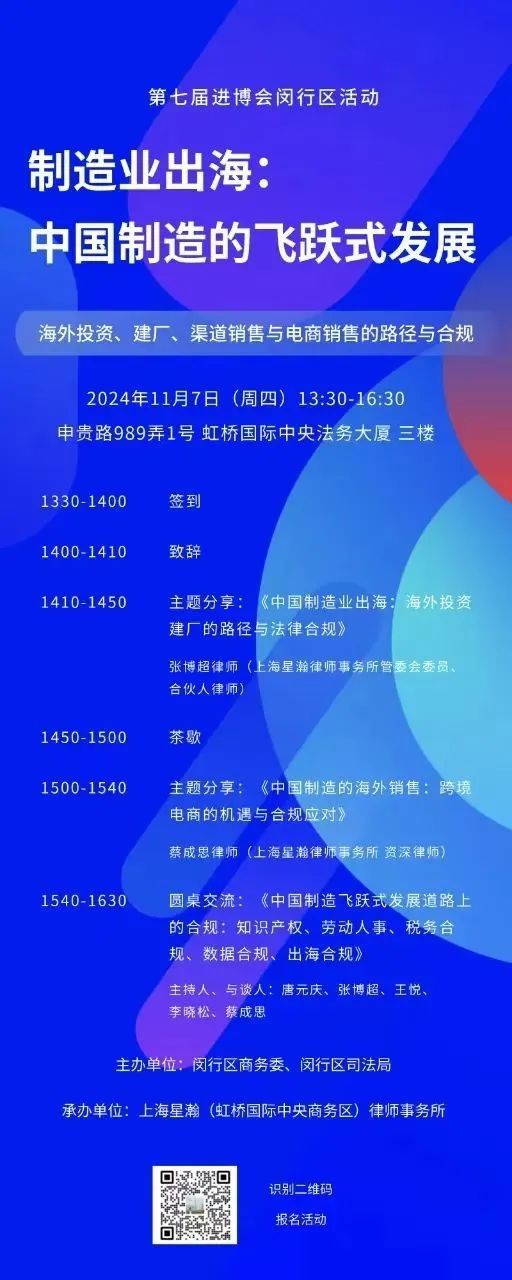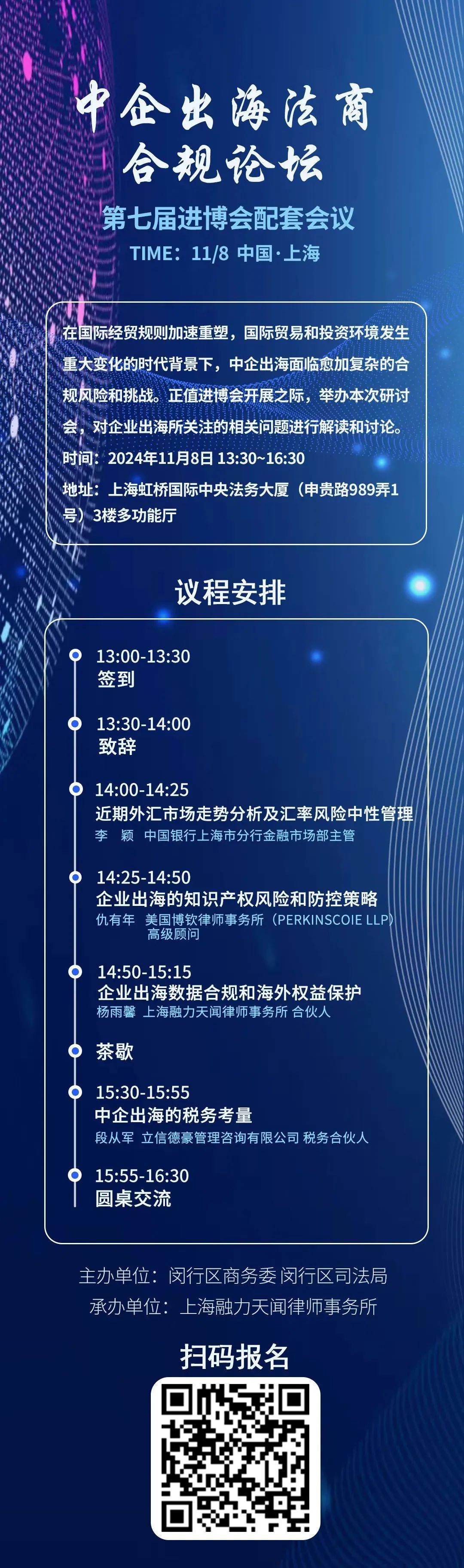 在国际经贸规则加速重塑,国际贸易和投资环境发生重大变化的时代背景下,中企出海面临愈加复杂的合规风险和挑战。正值进博会开展之际,举办本次研讨会,对企业出海所关注的相关问题进行解读和讨论。