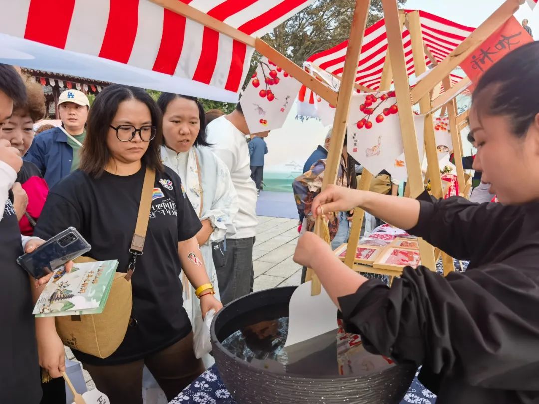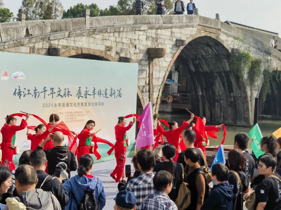 午饭刚刚过后,大仓桥畔就热闹起来了,剪纸、糖画、面塑、钩针编织、松江布、余天成堂传统中药文化等非遗体验摊位丰富多彩,现场还有江南丝竹、松江农民书、庄泾船拳等文艺演出。早到的队员们一边闲逛集市,一边等候出发。主办方向所有报名者配发了活动T恤、分组手环、小组队旗、行走背包等装备,背包内还贴心地放了打卡地图、水和点心。