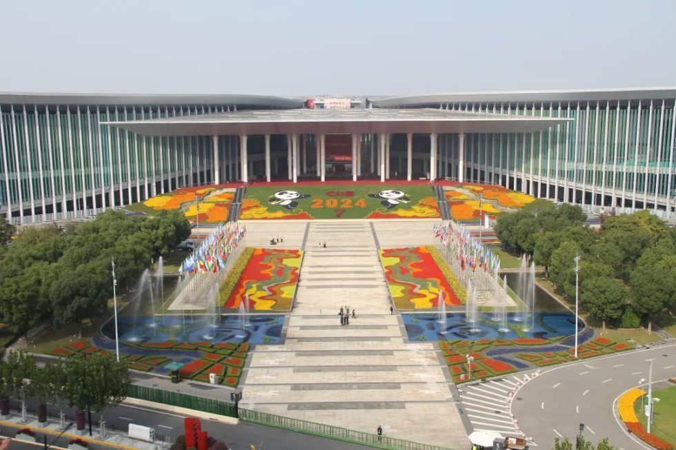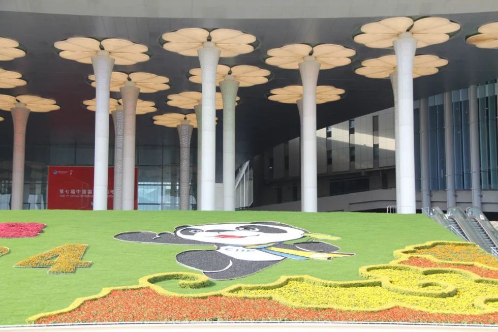国家会展中心(上海)南广场以熊猫“进宝”及周围装饰点缀第七届进博会。南广场繁花似锦,10500平方米、68万盆花卉在阳光下摇曳。24节气景观柱庄严雅致,闪烁彩光。会议中心(西厅)沿用“日出东方”主题,红色百日草及三角梅花柱营造庄重热烈气氛。