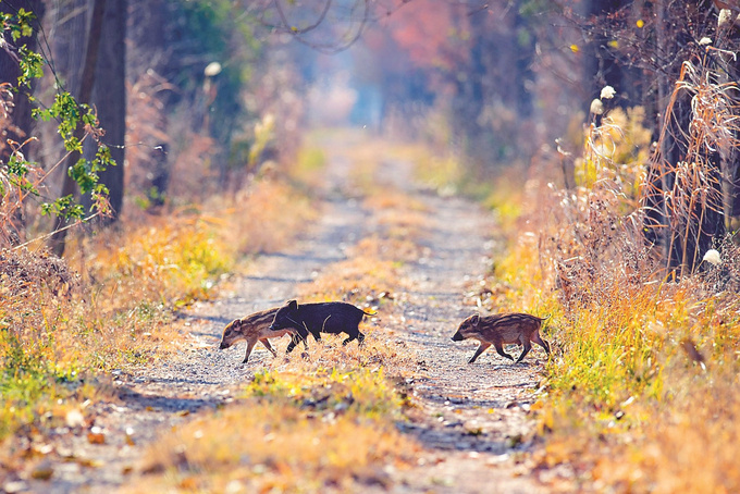 南京市新生洲上小野猪结伴“轧马路”。 新华日报·交汇点记者 吴俊 摄