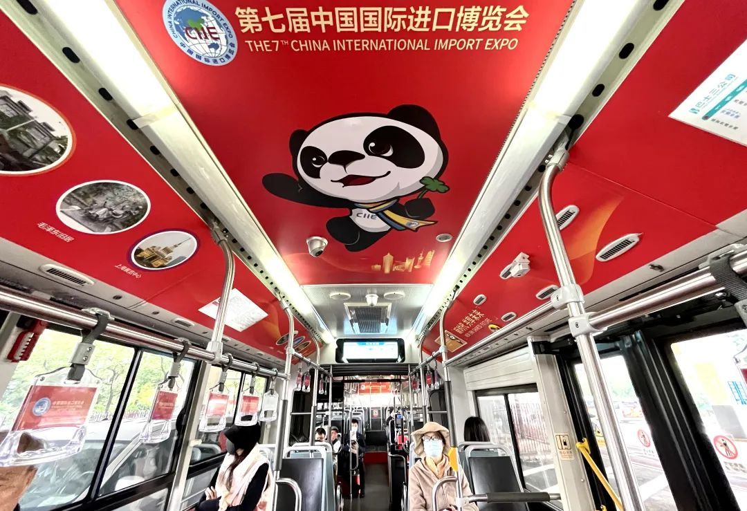该辆专车的车内装饰以红色为主色调,乘客一上车,就能看到吉祥物“进宝”热情地与大家打招呼,车厢顶端还张贴着大幅进博亮相海报,在车厢两侧则有上海毛泽东旧居陈列馆、中共二大会址纪念馆等上海著名景点图案,让乘客在乘车的同时也能感受到浓浓的红色文化氛围。