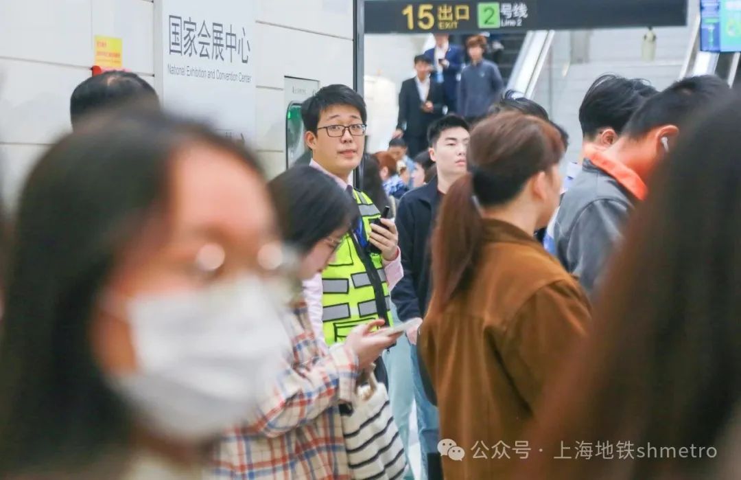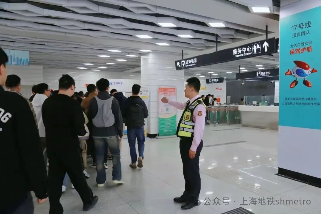双保驾,安全感UP:11月5日运营开始至13:30,2号线国家会展中心站实施封站,17号线国家会展中心站承担起服务参展乘客出行的主力任务。为做好展会集中进场时段车站保驾工作,17号线国家会展中心站实行值班站长双岗作业、站区站长双人保驾,结合现场实际,及时调整客运组织措施。车站值班员通过CCTV加强客流监控,以便及时处理突发情况。