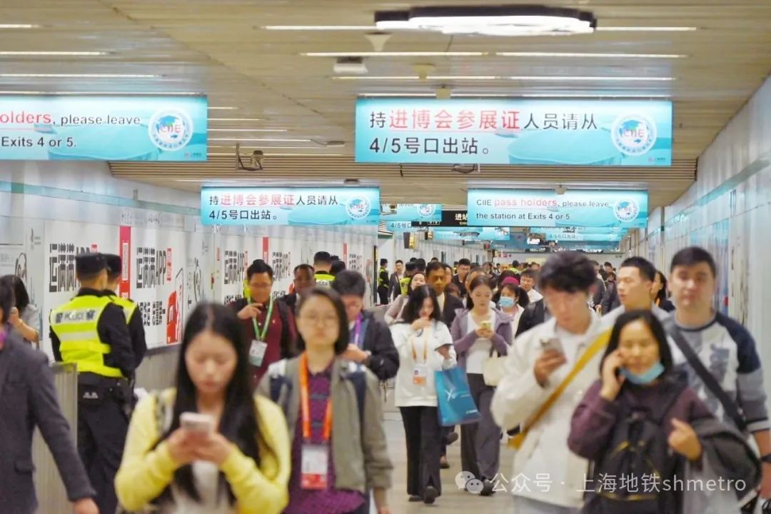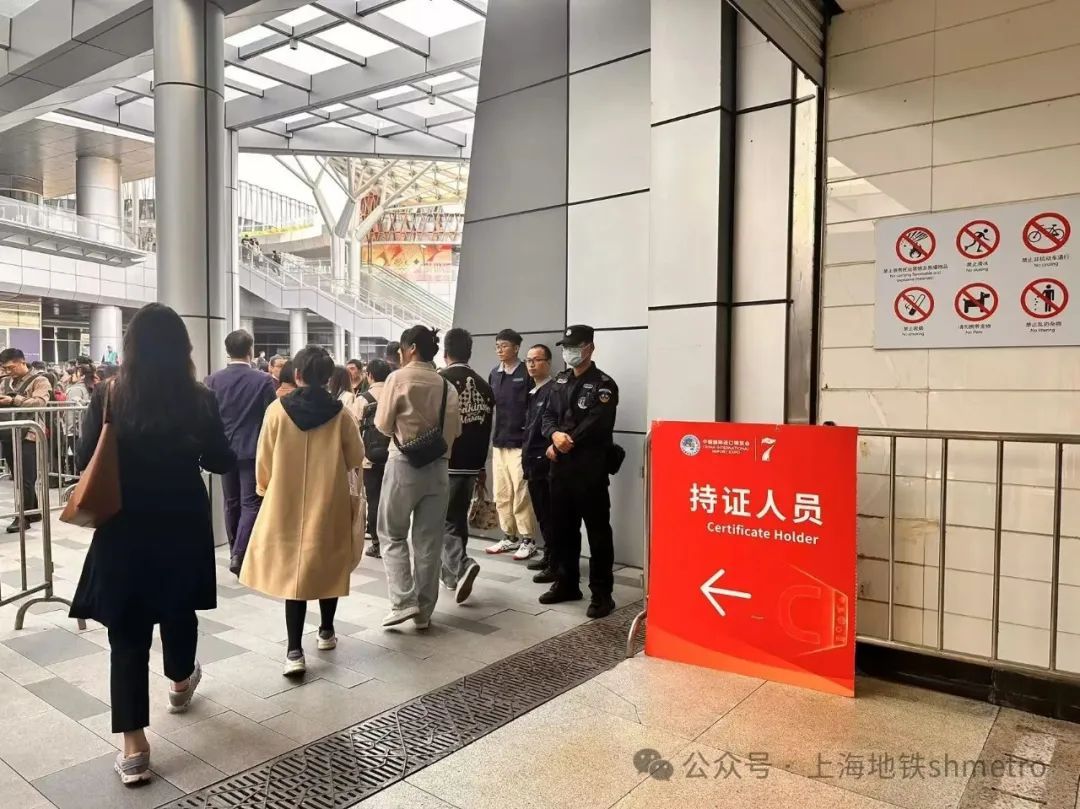 多举措,确保运营更平稳:2号线国家会展中心现场联合指挥点对运营保障情况进行全面监控,掌握“三线三站”客流变化,及时协调指挥现场客运组织工作,保障乘客安全出行。根据车站客运组织安排,车站在进场时段采取4、5、8 号口“单向出站”,9号口“单向进站”,6号口“可进可出”模式(非进博会参展持证人员从 6、8 号口出站)。车站工作人员通过广播、手持无线扩音器不间断向乘客宣传走行路线,配合下拉式导向及时对参展乘客做出指引。车站积极协同多方力量,通过科学调度、高效指引以及完善的保障措施,全力做好客运组织工作。