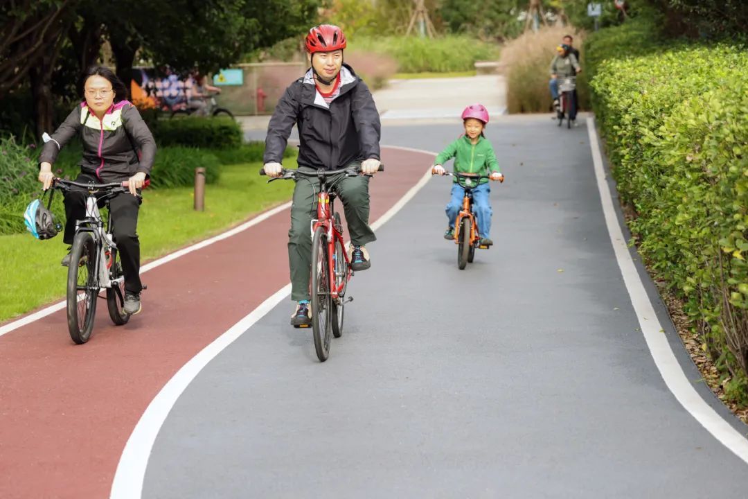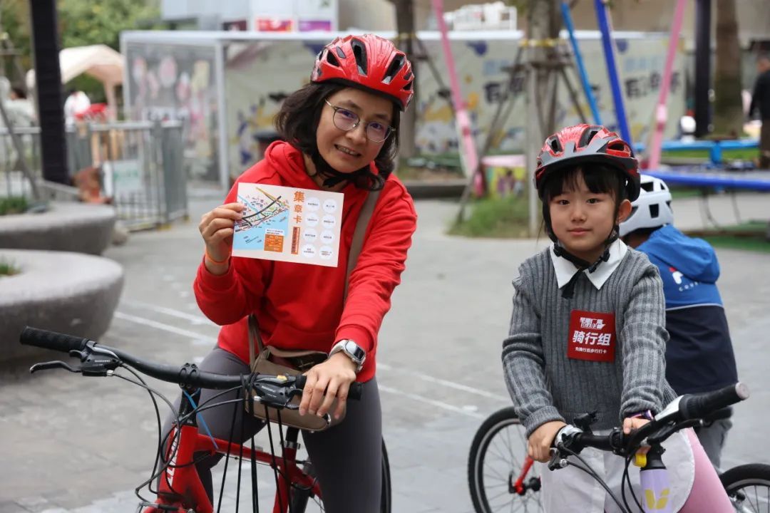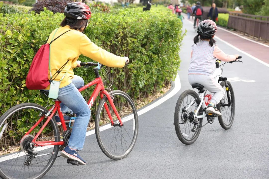 小朋友们在大人的陪伴下,按骑行组和步行组有序出发,从东方渔人码头起步,经过城市规划馆、祥泰木行、绿之丘、世界技能博物馆等杨浦滨江沿线标志性建筑和景观地,到达终点宁国路渡口。一路上,滨江的美景尽收眼底,秋日的暖阳洒在江面上,波光粼粼,让人心旷神怡。小朋友们一边骑行,一边兴奋地指着路边的风景,与父母分享着他们的喜悦和发现。而步行组的家庭们则更加悠闲地享受着这段旅程,他们一边漫步,一边欣赏着滨江的美景和独特的工业遗迹。