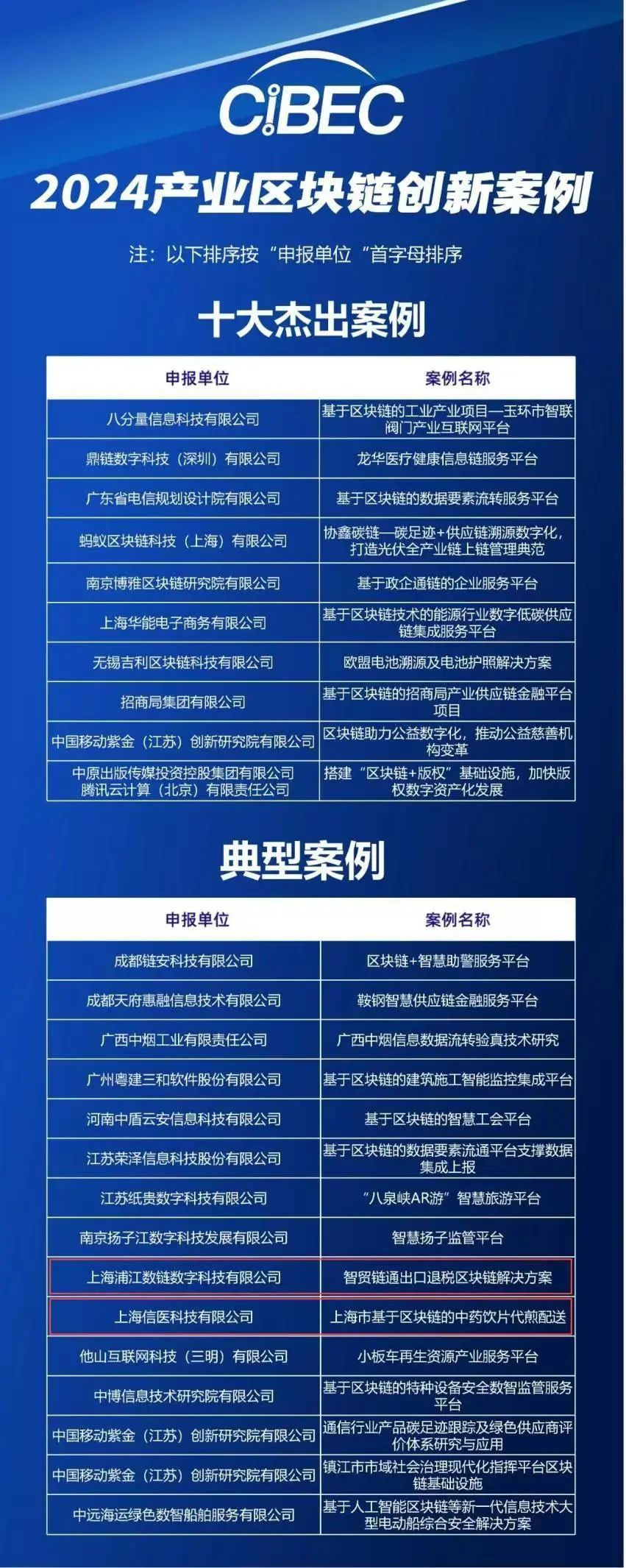 在2024产业区块链创新案例的评选中,上海浦江数链数字科技有限公司的“智贸链通出口退税区块链解决方案”和上海信医科技有限公司的“上海市基于区块链的中药饮片代煎配送”两个案例脱颖而出,成功入选。