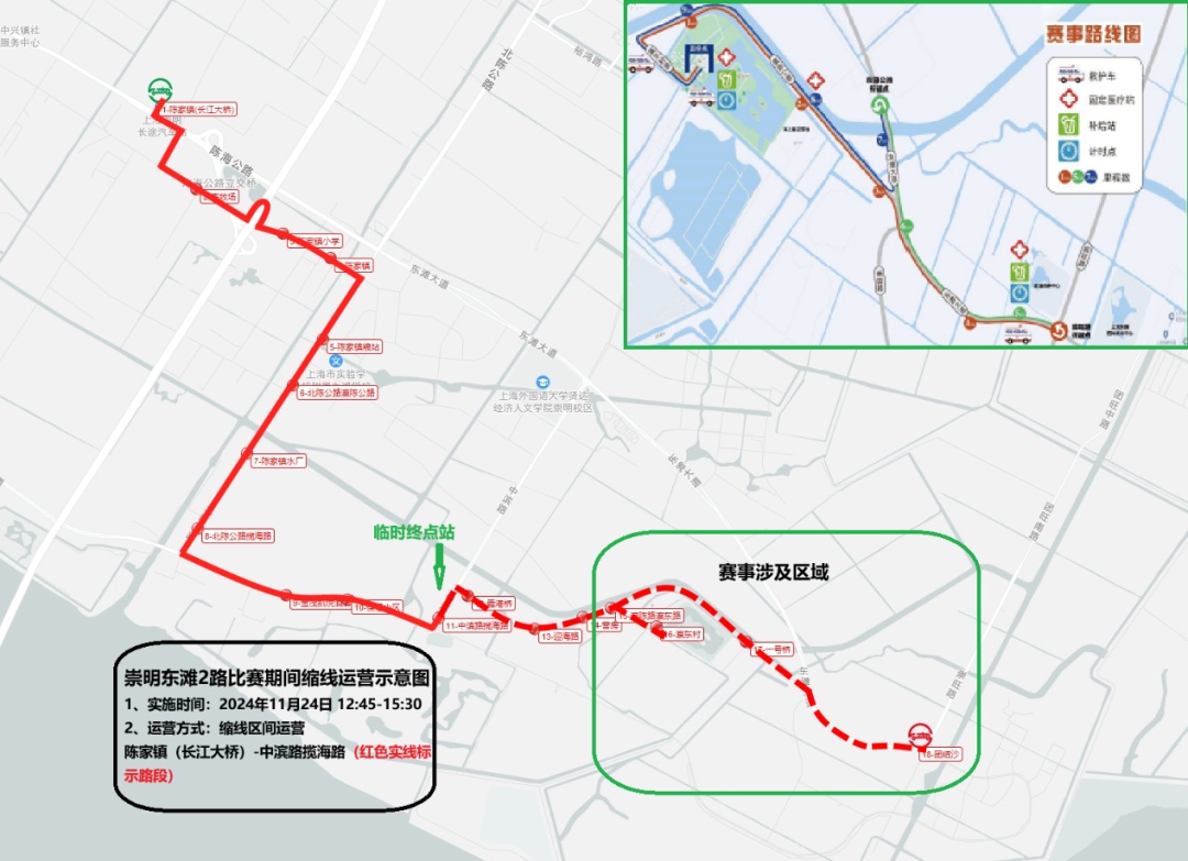 小编从崇明巴士了解到,2024年11月24日(周日),第七届上海(崇明)休闲体育大会十公里精英跑将在陈家镇举行。根据赛事期间交通管制工作方案,崇明巴士将对受影响的崇明东滩2路采取临时缩线调整措施,请市民乘客相互转告,以免耽误出行。