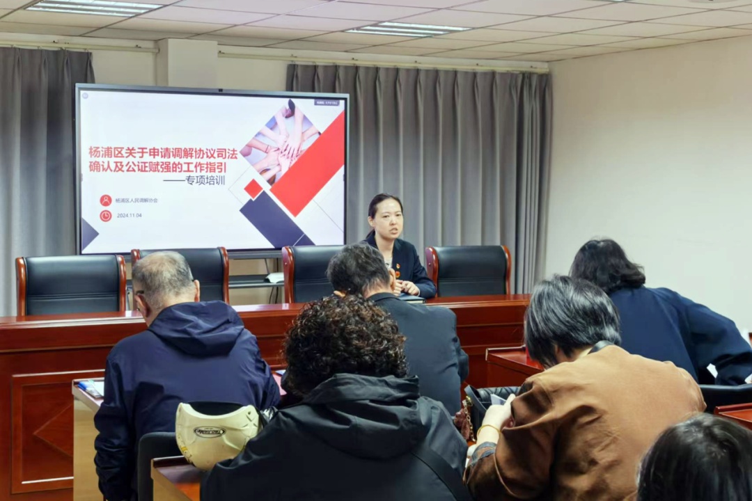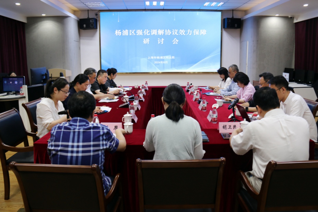 以理论研究为先导,夯实制度基础。组织召开杨浦区强化调解协议效力保障专项研讨活动,邀请专家学者、市局处室以及法院、公证处负责人、调解组织代表等开展专题研究,为实践探索打牢理论基础。