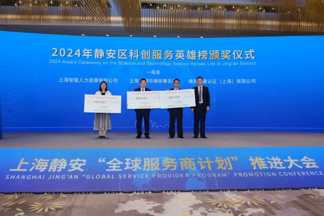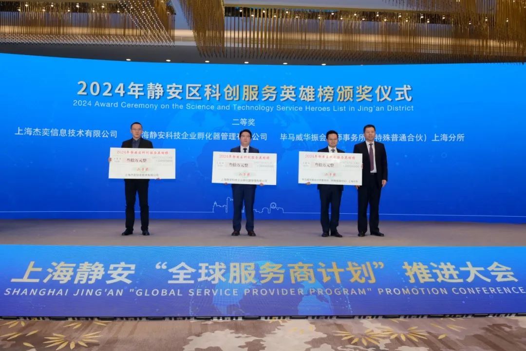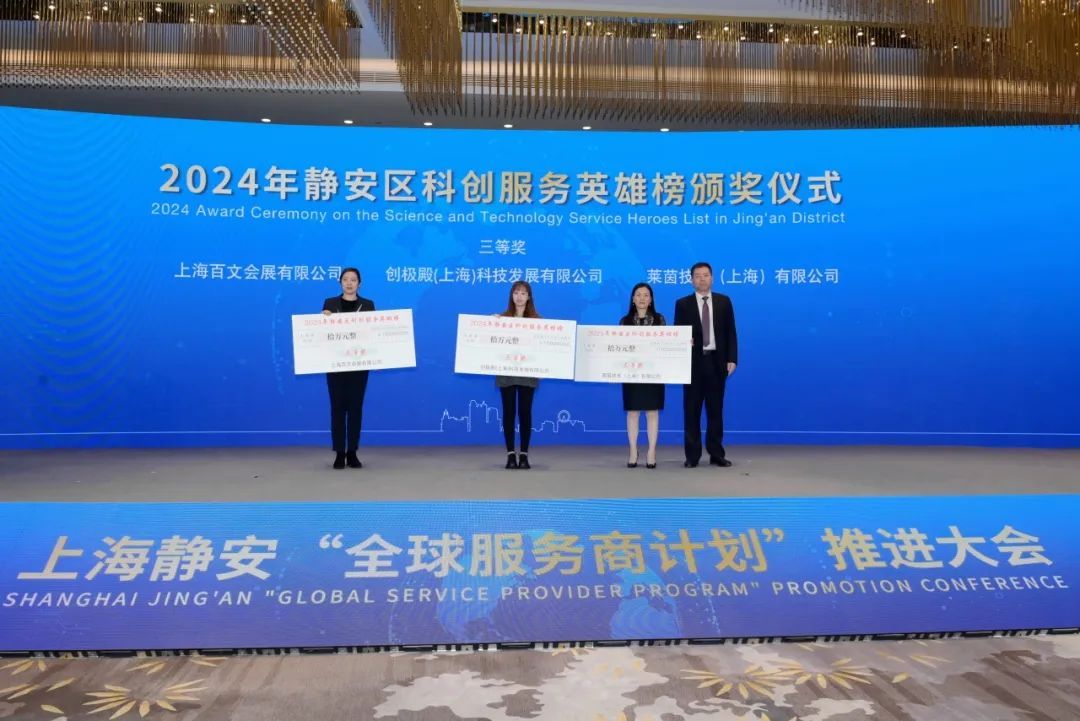 翟磊为9家在推动科技创新和专业服务领域作出杰出贡献的企业颁发“2024年静安区科创服务英雄榜”奖牌及奖金,鼓励更多专业服务业企业服务科技创新。