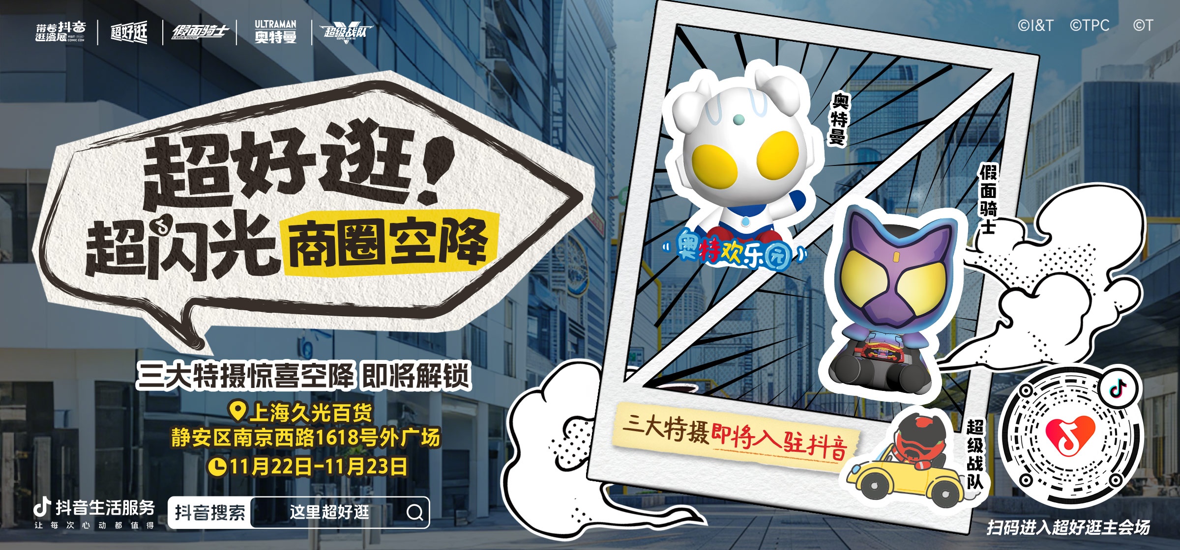 11月22日-23日,假面骑士、奥特曼、超级战队三大特摄IP空降久光百货外广场,与市民朋友近距离接触。据悉,「抖音超好逛」联合三大特摄IP打造“超好逛超闪光”商圈bigday,本次bigday结合三大特摄(奥特曼、假面骑士、超级战队)入驻抖音事件,线下带来“超好逛,超闪光”抖音限时快闪。