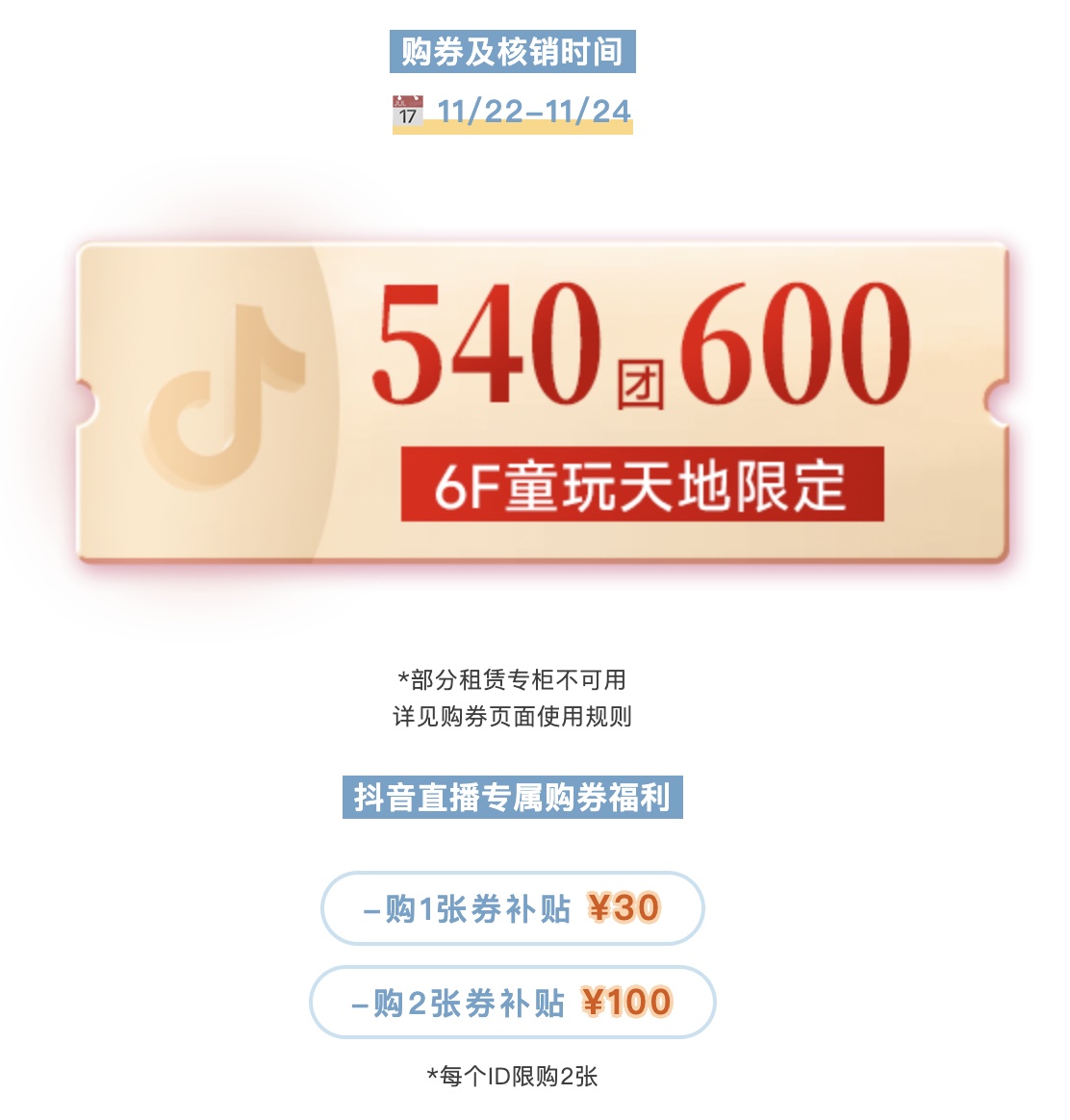 超好逛必买清单:久光百货美妆、亲子代金券惊喜上线,抖音优惠精彩不断,这里超超超优惠;抖音团购券540代600团购券(抖音补贴满500减30,满1000减100券),相当于510团600,980团1200(2张)