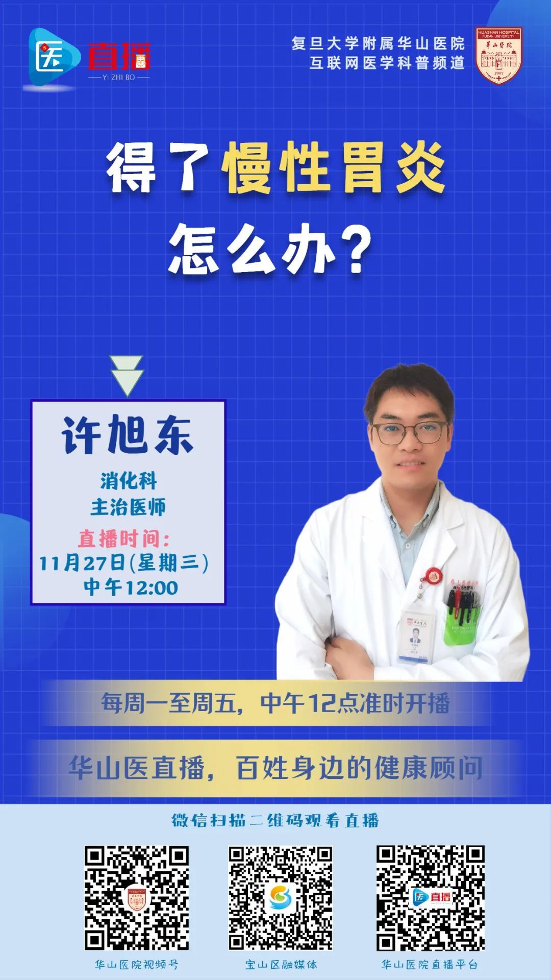 您是否也遭受“嗳气、上腹痛、餐后饱胀”等症状的困扰?幽门螺旋杆菌、萎缩性胃炎、肠化生的问题是否也让您忧思过度、彻夜难眠?本期医直播,许旭东将为您深度解析消化科的常见病——“慢性胃炎”,送您一份靠谱的“胃健康”指南。