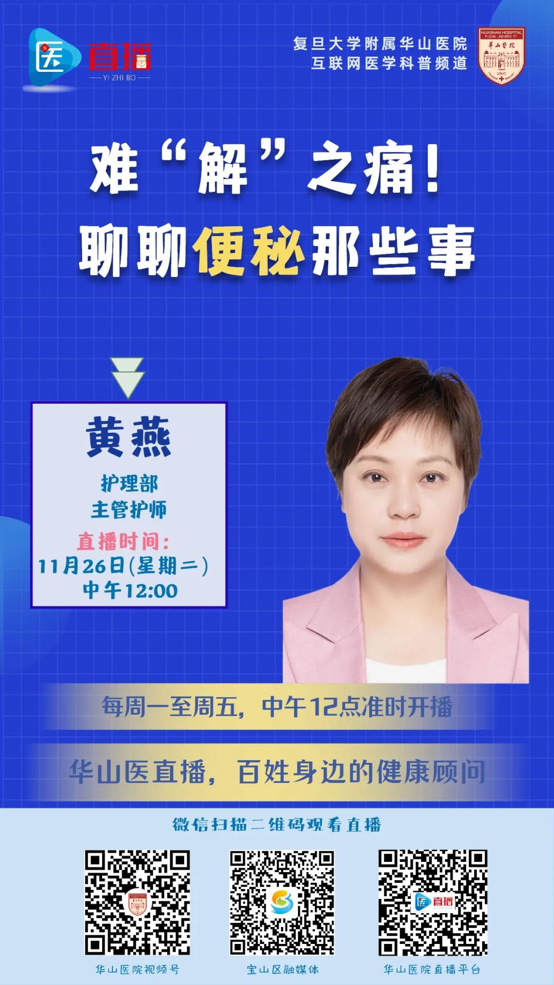 有一位患者曾说:“我现在每天上厕所都像在战斗,大便不好排,肚子胀,很痛苦。自己偷偷买药吃,效果却越来越差。”到了医院才知道,这是病,得治。而这个病就叫便秘。什么是便秘? 一句话:拉得不爽。便秘是指大便次数减少,一般1周少于 3 次,伴有排便困难、粪便干结或不尽感。本期医直播,黄燕为大家讲解便秘那些事。