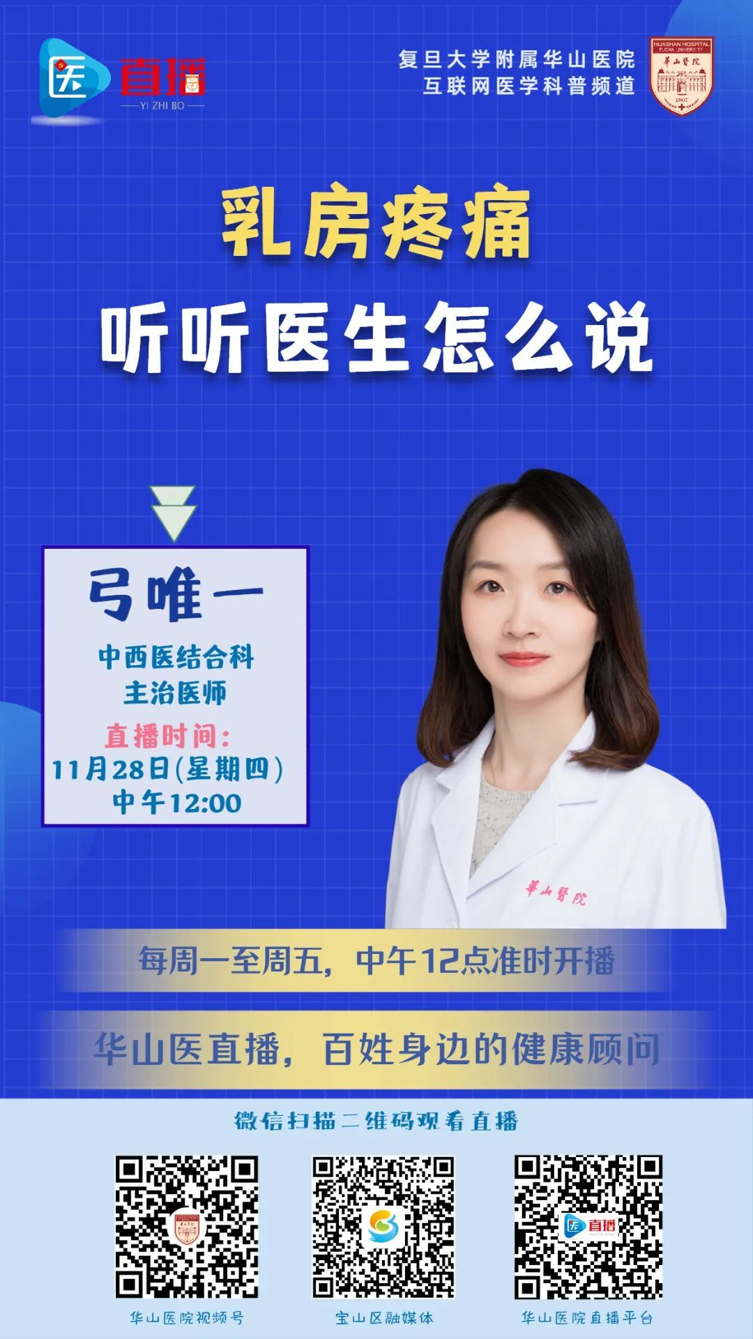 70% 以上的女性一生中都经历过乳房疼痛。乳房疼痛是病吗?乳房疼痛是乳腺癌的先兆吗?乳房疼痛都需要治疗吗?本期医直播,弓唯一将围绕乳腺疼痛的成因、分类、评估及治疗等方面,向您全面介绍乳房疼痛的来龙去脉,并为您讲解守护乳腺健康的中西医保健方法。