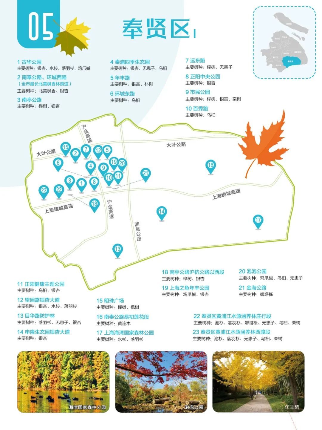 进入深秋,银杏、乌桕、枫香、娜塔栎……纷纷换上彩色新衣妆点申城。市绿化市容局为大家准备了上海红叶地图,包含本市浦东新区、闵行区、松江区、金山区、奉贤区、嘉定区、宝山区、崇明区、青浦区这9个区的林地、公园、苗圃、道路等多种类型的彩叶树种观赏点。一起来看看美丽的彩叶都在哪里吧~