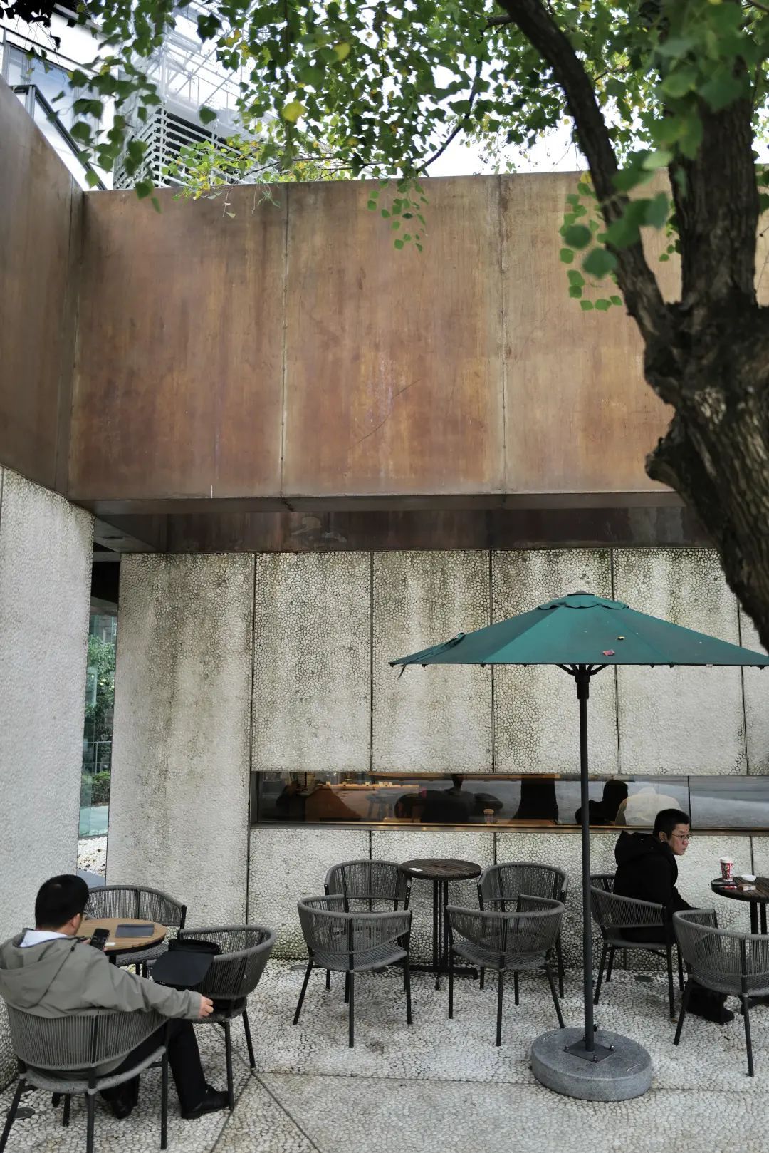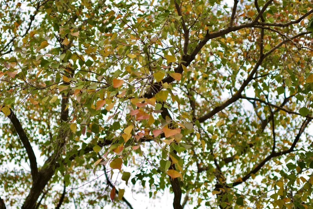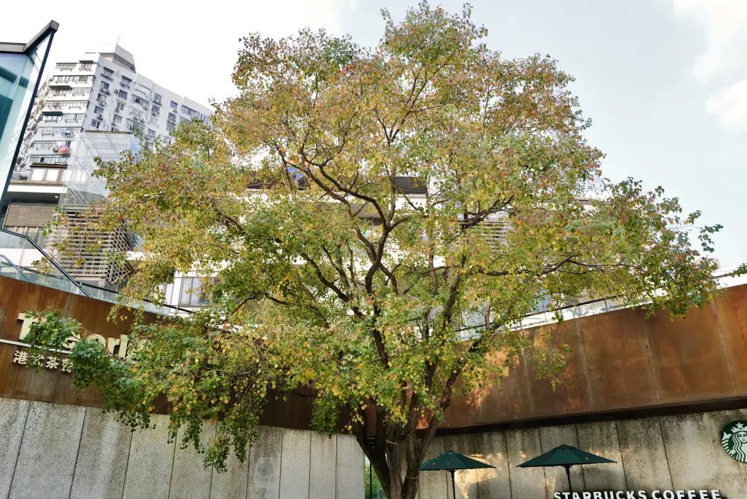 大部分树木在这个季节变色后颜色单一,乌桕树却是少有的一棵树集满了赤橙黄绿紫彩虹色的神奇存在。在活水公园里的咖啡馆边上,这颗乌桕树顶着斑斓的颜色让路过的人很难忽视它。
