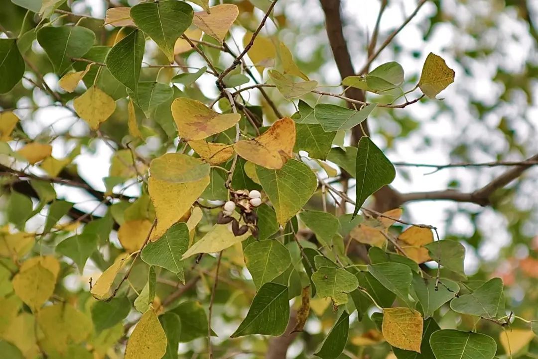 乌桕树是我们国家独有的树种,作为秋天的观赏树,它的美一点不输给枫树和银杏树。它的叶片似一颗大大的爱心。记者在周围观察一圈,变色后的乌桕树叶几乎没有一模一样的颜色。渐变的色彩仿佛叶子似乎被颜料晕染过,不禁让人感慨自然界的神奇魅力。乌桕树冠形态优美,枝叶繁茂,它的枝条蜿蜒曲折,造型苍劲有力,用来插花极具东方的审美意境。乌桕树果壳剥落后露出白白圆圆的果实,远处看像爆米花。记者在树下停留的时候,不时看到有鸟飞来啄果子好不热闹。它的果子是鸟儿过冬不错的食物。