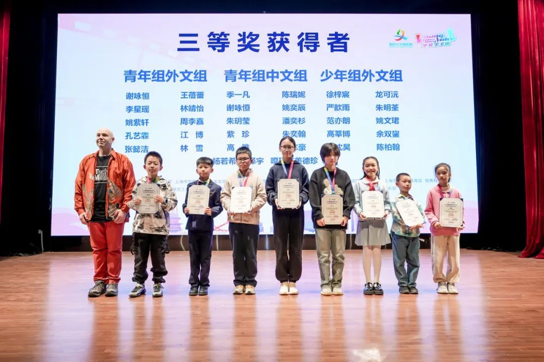 经过严格评审,上海市民办协和双语学校李籽妗的《申生不息》、上海外国语大学附属浦东外国语学校周忻妤的《Hello, Shanghai's 4 King Kongs》、上海市嘉定第一中学朱晔宸的《青年意气千古驰骋》、上海市风华初级中学芮绮卿的《Ascending to Heaven Descending to Earth》等四部短视频作品分别荣获少年中文组别、少年外文组别、青年中文组别、青年外文组别的特等奖。