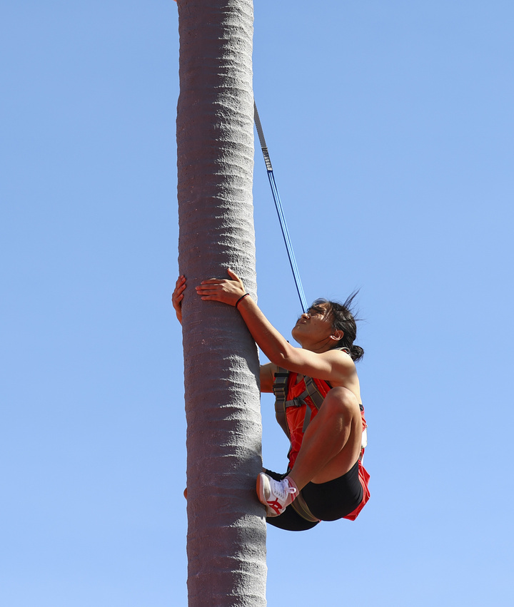 爬树也能拿冠军?攀椰竞速是本届运动会的新设竞赛项目,源于海南当地群众徒手爬树摘椰子的生活劳作场景,后来发展为民间喜闻乐见的“摘椰子”比赛活动,极具地域特色。攀椰竞速看似难度不大,实则颇具挑战性。男女运动员需分别在9米、7米高的天然椰子树或仿真椰子树上自选姿势,不借助任何工具,攀爬到椰子树顶端触碰计时按铃,用时最短者获胜。