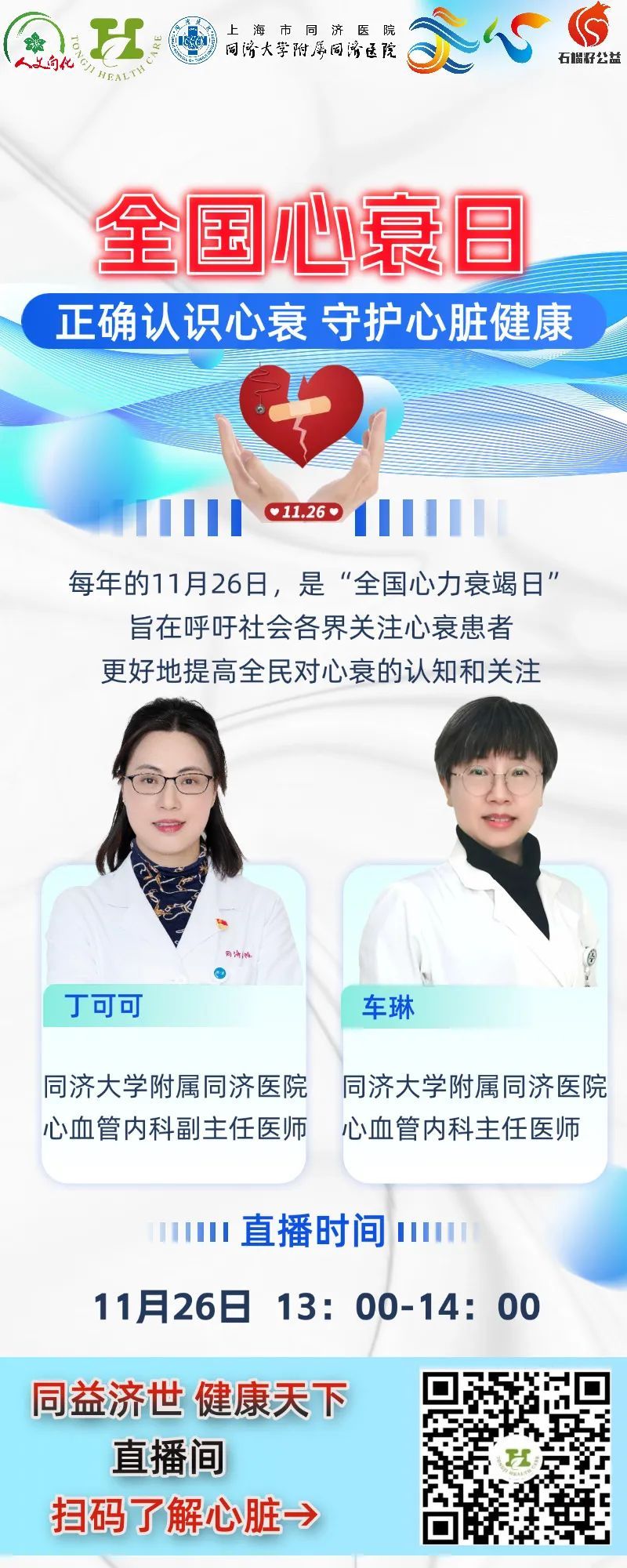 为了呼吁社会各界关注心衰患者,更好地提高全民对心衰的认知和关注,普及健康知识,11月26日下午,由同济大学附属同济医院主办,同济大学附属同济医院心血管内科、体检与健康管理医学中心、社工部、上海崇明石榴籽公益发展中心、崇明区向化镇人民政府联合承办,开展“同益济世 健康天下”直播间线上健康科普讲座活动。