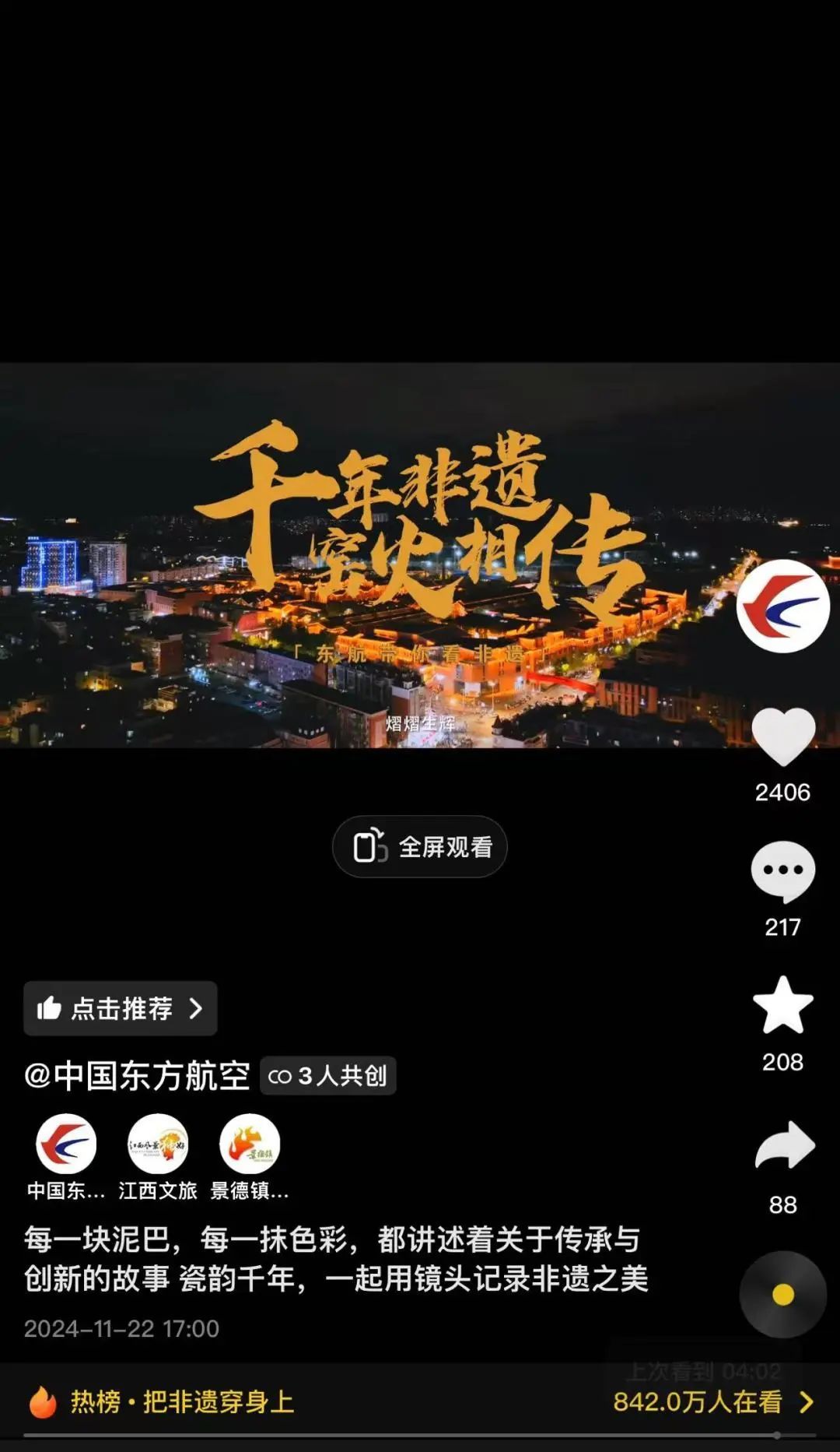 抖音、快手共发布10期内容,总播放量52万。其中“每一块泥巴,每一抹色彩,都讲述着关于传承与创新的故事 瓷韵千年,一起用镜头记录非遗之美”收获了大量关注、互动与点赞。