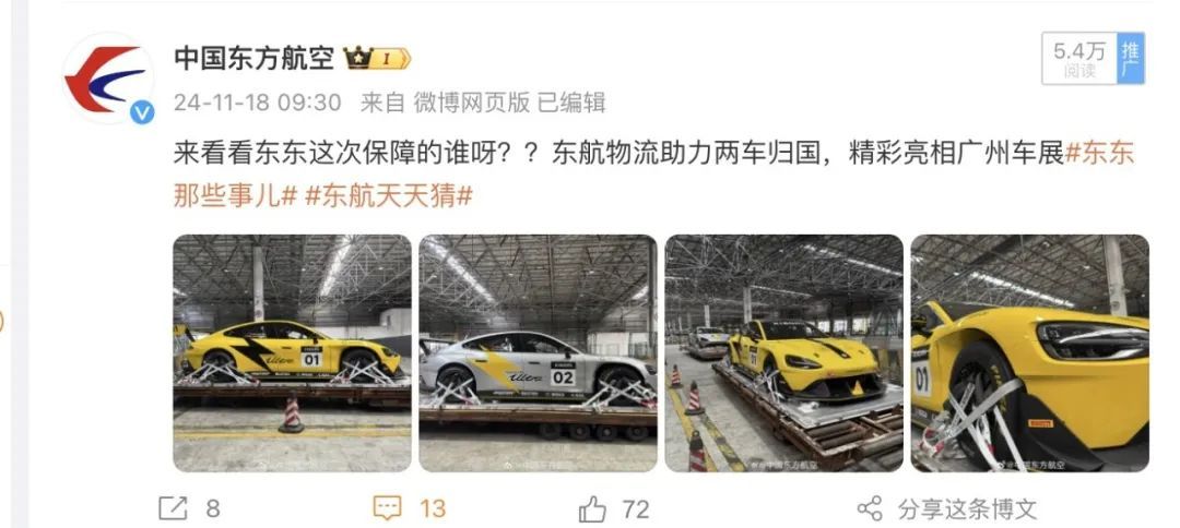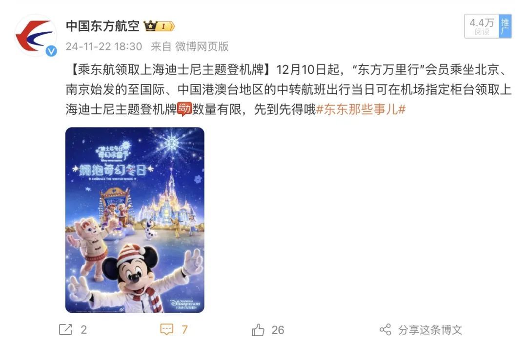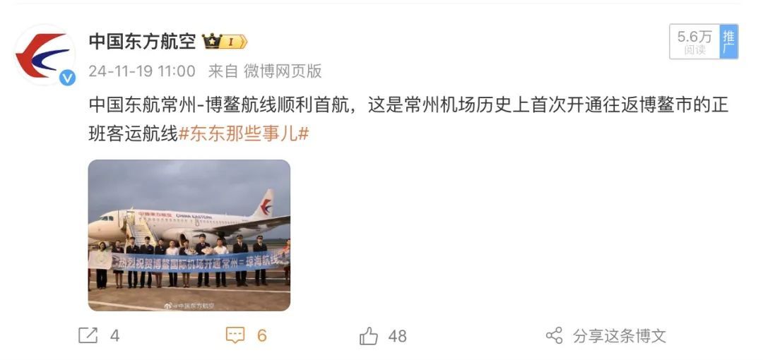 微博共发布15条内容,总流量61.8万。其中,“乘东航领取上海迪士尼主题登机牌”、“东航物流助力两车归国,精彩亮相广州车展”、“中国东航常州-博鳌航线顺利首航”获得了更多的曝光量。