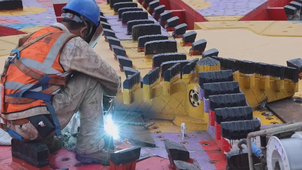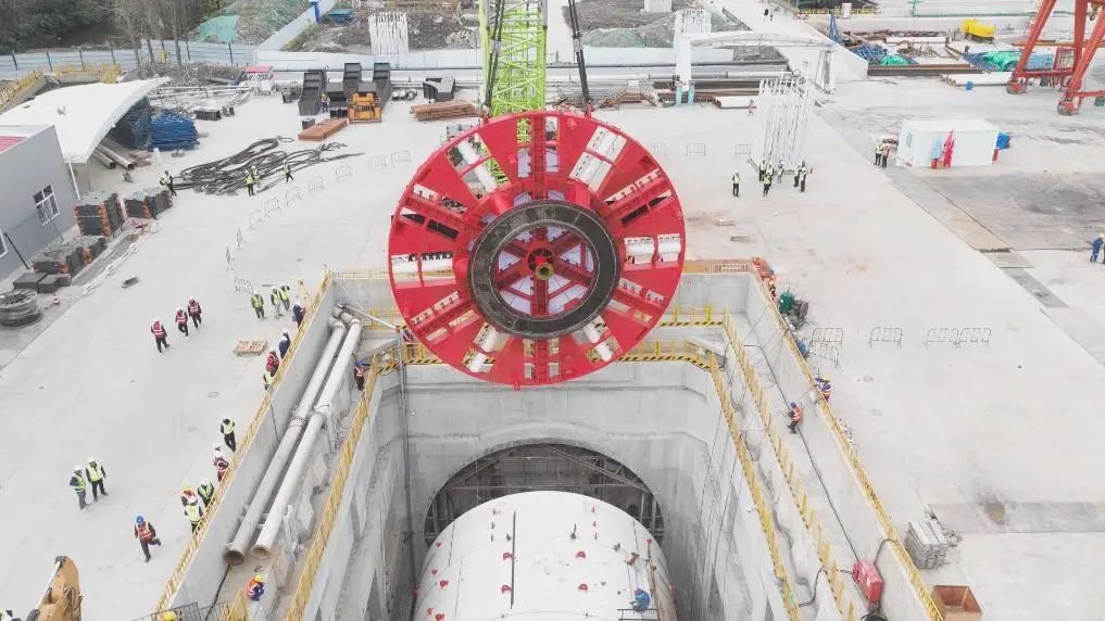 “新征程号”盾构机整机总长101米,最大开挖直径13.5米,重2634吨,装机总功率6500千瓦。此次吊装下井的刀盘重320吨,由1个中心块与6个分块拼装焊接组成,当天,“新征程号”盾构机刀盘在500吨履带吊和350吨履带吊的协同操作与地面作业人员和井下作业人员的密切配合下,通过起吊、翻身、旋转等一系列操作,成功吊装下井,并精准对接在主驱动上。下一步,项目团队将即刻启动管线连接、各系统空载试验和整机联调联试等工作,为后续盾构始发夯实基础。