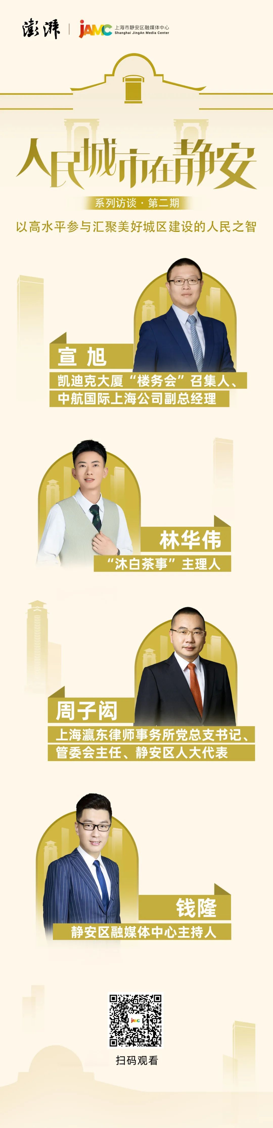 在本期节目中,静安区融媒体中心主持人钱隆在张园安垲第二楼,对话上海瀛东律师事务所党总支书记、管委会主任、静安区人大代表周子闳,凯迪克大厦“楼务会”召集人、中航国际上海公司的副总经理宣旭,沐白茶事主理人林华伟,围绕城市治理的高水平参与,分享他们如何尊重民意、汇集民智、凝聚民力,发挥聪明才智和公共责任参与静安的建设和发展。