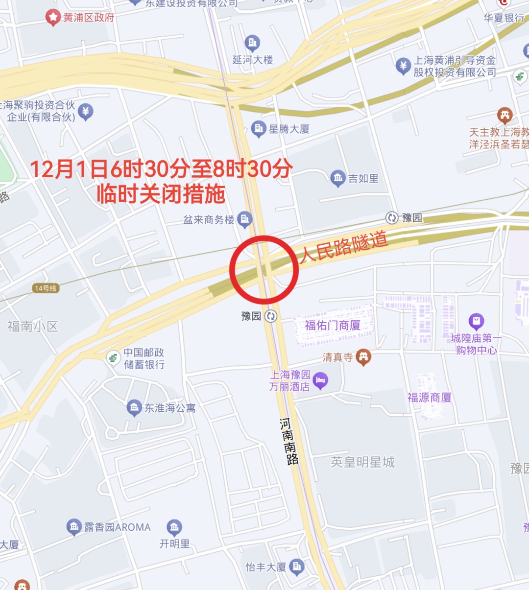 From 6:30am to 8:30am, the Henan Road S. exit of the Renmin Road Tunnel will be closed.