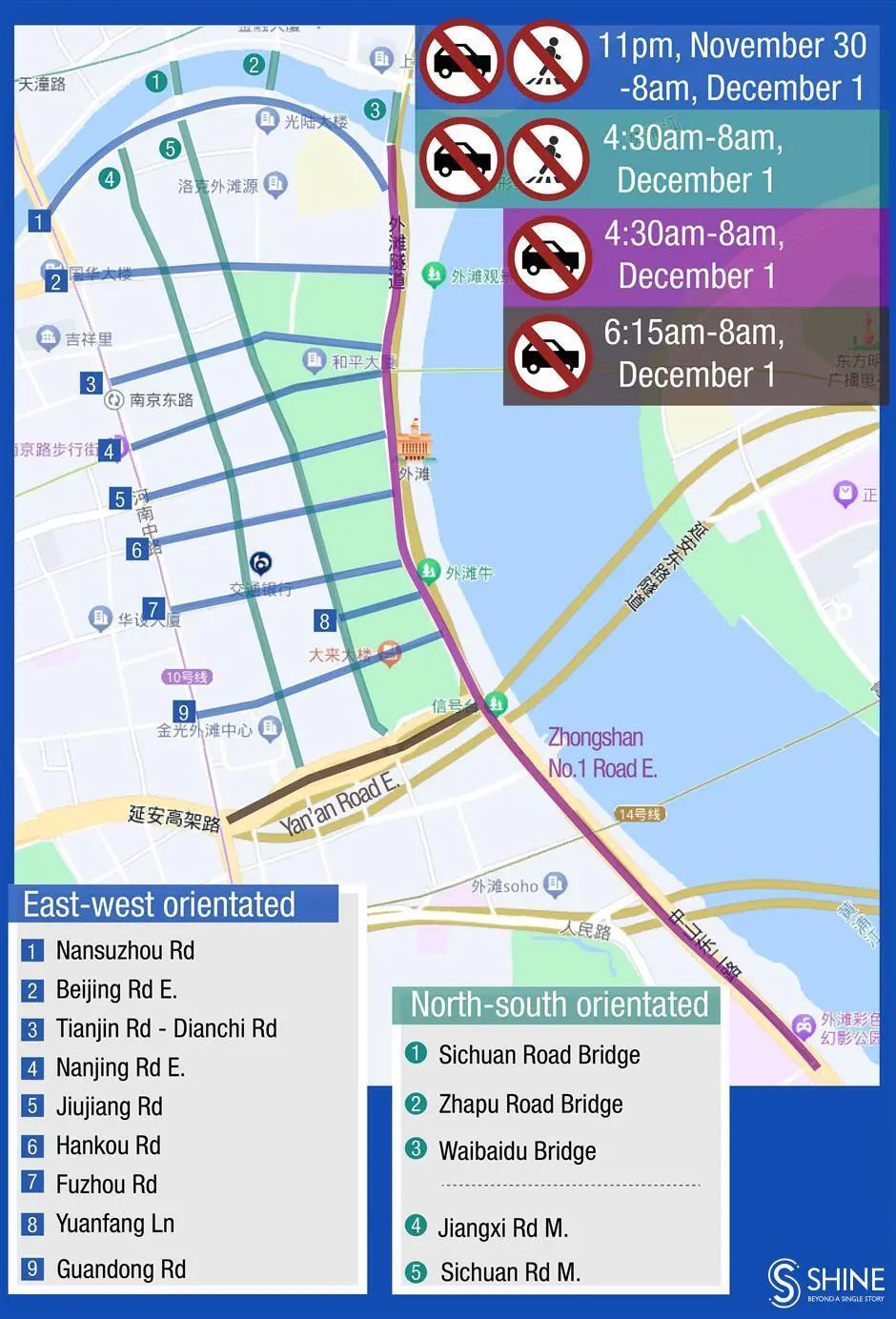 Vehicles and pedestrians are also barred from using Jiangxi Road M. and Sichuan Road M. between Yan'an Road E. and Nansuzhou Road, as well as Waibaidu Bridge, Zhapu Road Bridge and Sichuan Road Bridge from 4:30am to 8am on December 1.