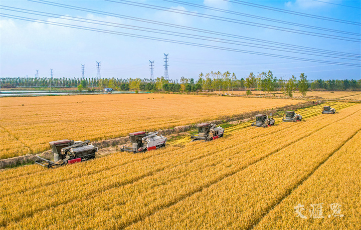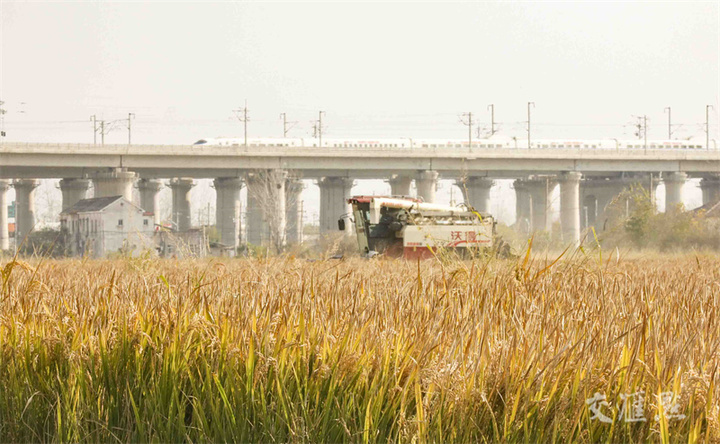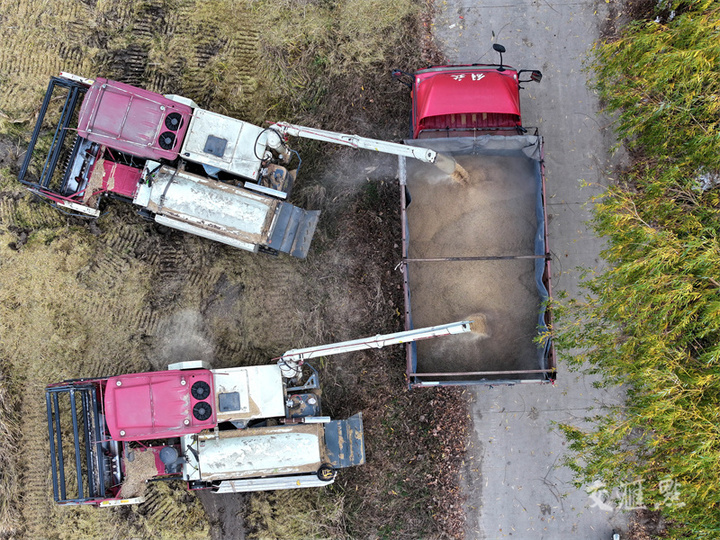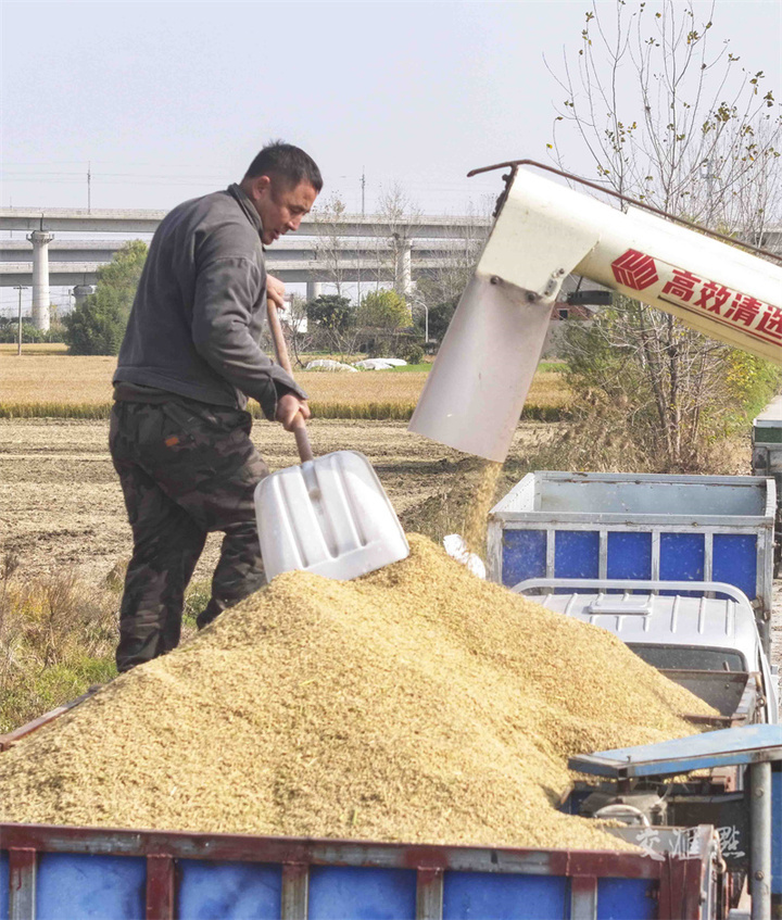 11月22日是小雪节气,淮安市淮安区郭湾村,村民抢抓晴好天气收获晚稻,确保颗粒归仓。赵启瑞摄 视觉江苏网供图