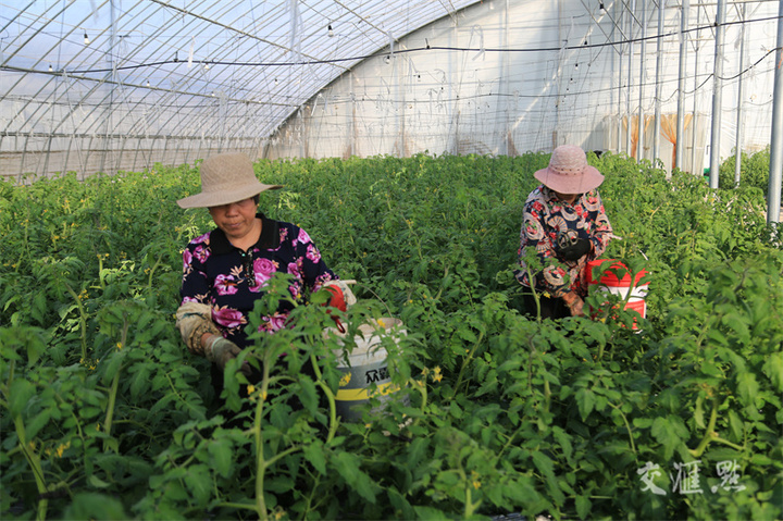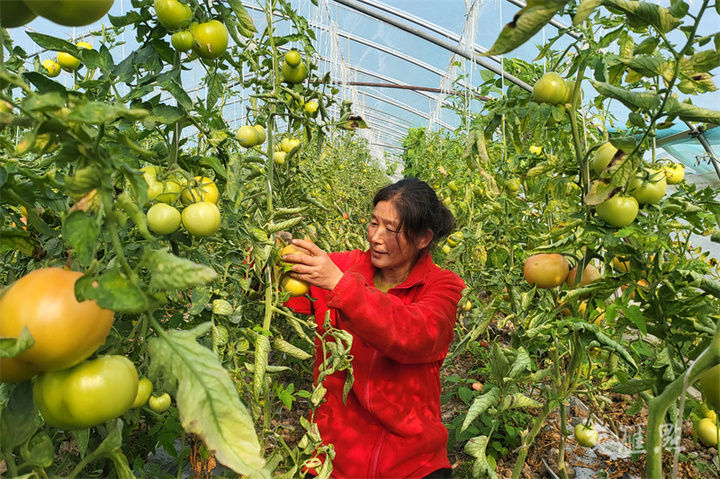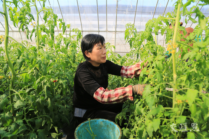 11月22日,连云港市海州区,工作人员在江苏农垦岗埠农场高效农业示范园西红柿种植大棚里,忙着给西红柿修剪打杈,促进西红柿生长。徐卫摄 视觉江苏网供图