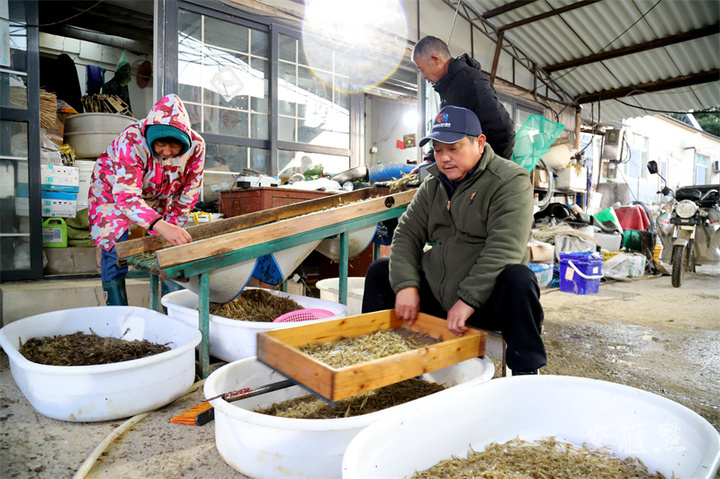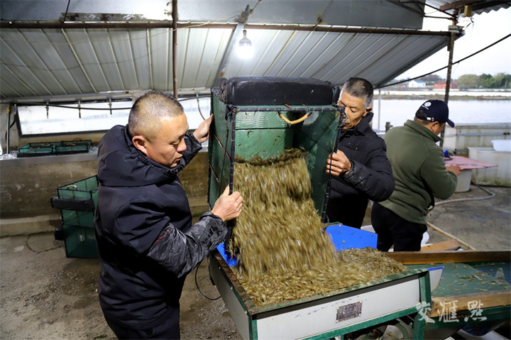 11月26日,村民正在南京市高淳区桠溪街道定埠村某水产养殖专业合作社,忙着筛选捕获的青虾,准备销往浙江市场。目前,该合作社养殖的2000多亩冬季青虾开捕上市,亩均产量约70公斤。高晓平摄 视觉江苏网供图