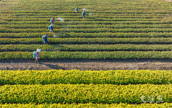 11月24日,沭阳县刘集镇,花农在花木基地对红叶石楠、女贞幼苗喷施药物,防治病虫害,做好田间管理工作。周永摄 视觉江苏网供图