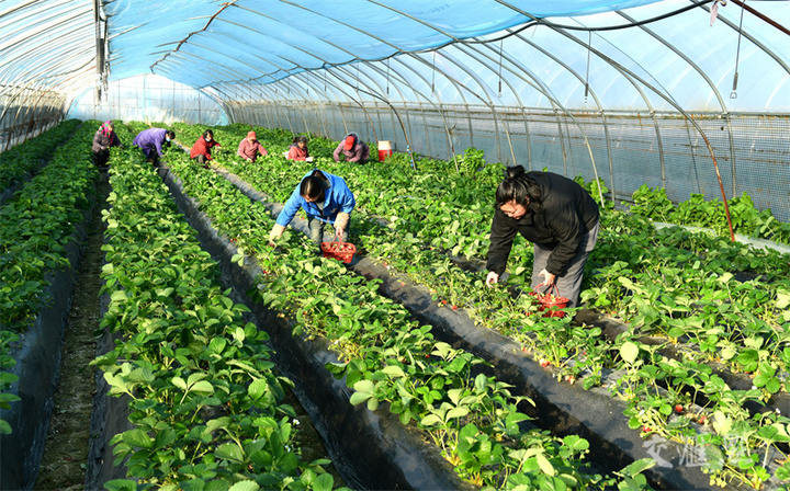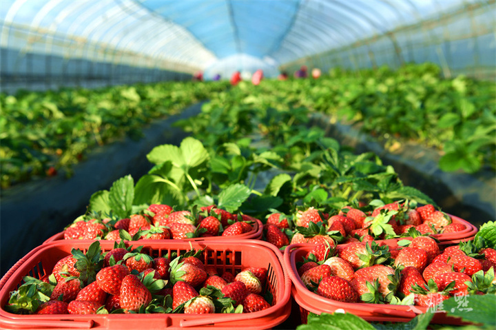 11月26日,工作人员在淮安市洪泽区东双沟镇阅湖公社草莓种植基地采摘草莓,准备供应城乡商超及水果市场。近年来,当地发展草莓种植业,带动村民增收致富。刘彬摄 视觉江苏网供图