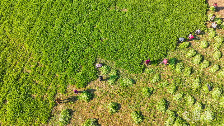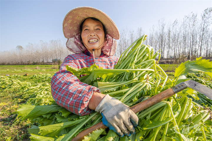 11月23日,泗洪县双沟镇雪三社区雪菜种植基地百亩雪菜喜获丰收,农民进行采收工作。近年来,雪三社区引导农户改善种植结构,带动农户增收。李佳摄 视觉江苏网供图