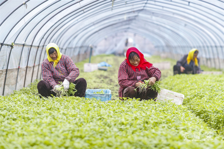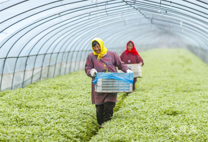 11月25日,农民在兴化市陈堡镇曹黄村蔬菜大棚内采收茼蒿,准备供应市场,丰富市民的“菜篮子”。周社根摄 视觉江苏网供图