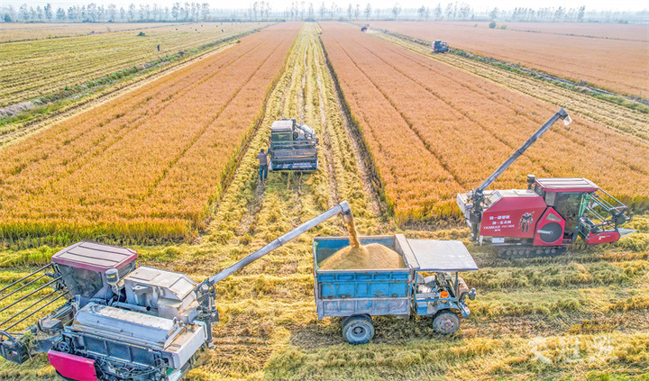 11月22日,泗洪县石集乡一家庭农场,农机手驾驶收割机在高标准农田里收割有机水稻,田间地头呈现一派忙碌景象。陈少帅摄 视觉江苏网供图