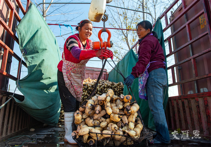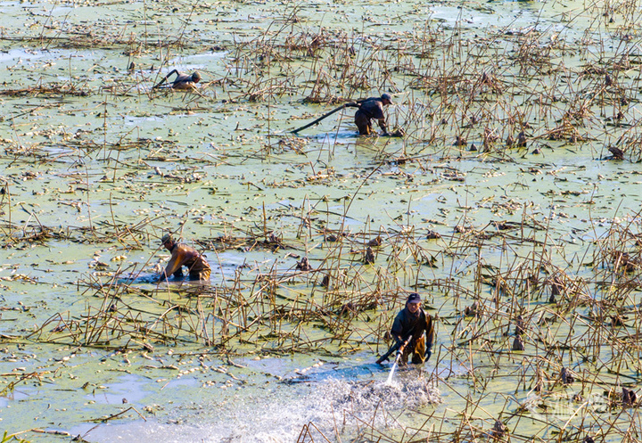 11月23日,淮安市淮阴区渔沟镇,村民在荷塘中采收浅水藕,一派繁忙景象。贺敬华摄 视觉江苏网供图