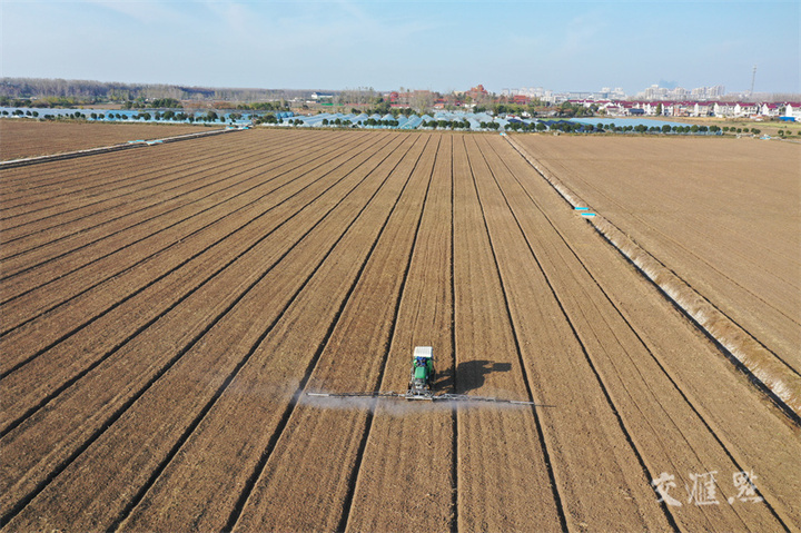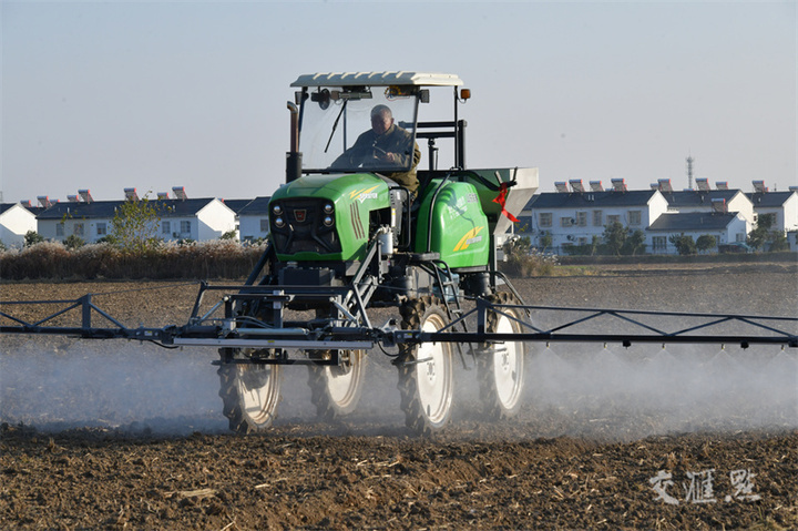 11月23日,淮安市洪泽区高良涧街道越城村,种粮大户驾驶机械对刚播种的麦田喷洒除草剂,做好田管工作。崔德圣摄 视觉江苏网供图
