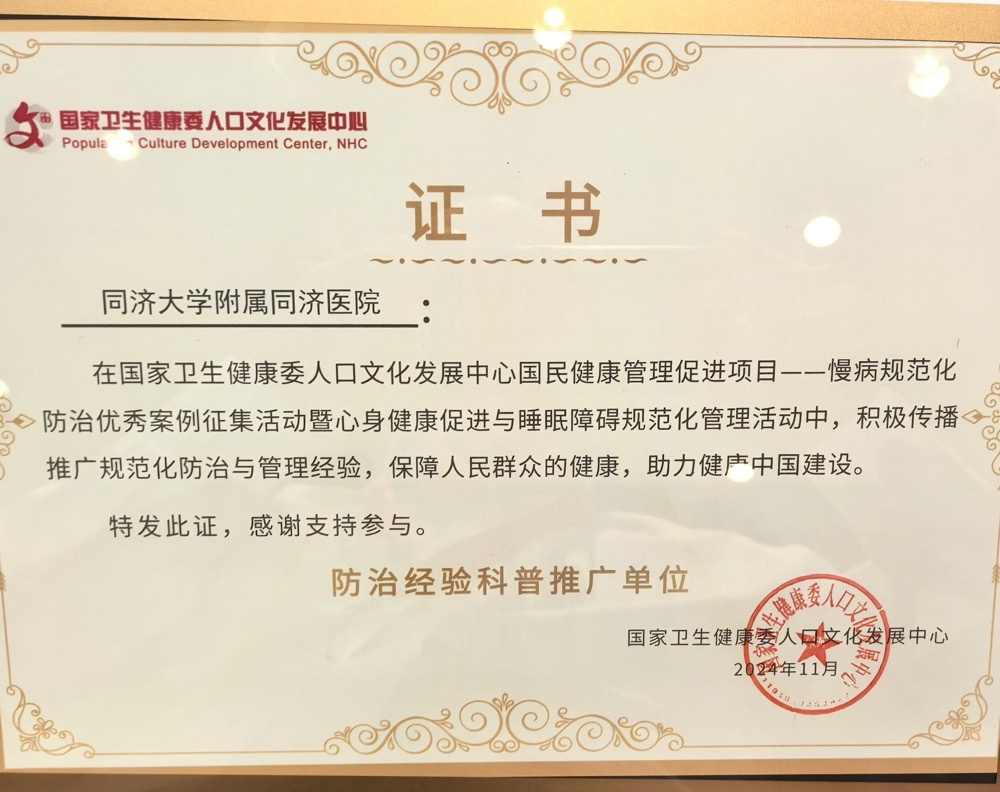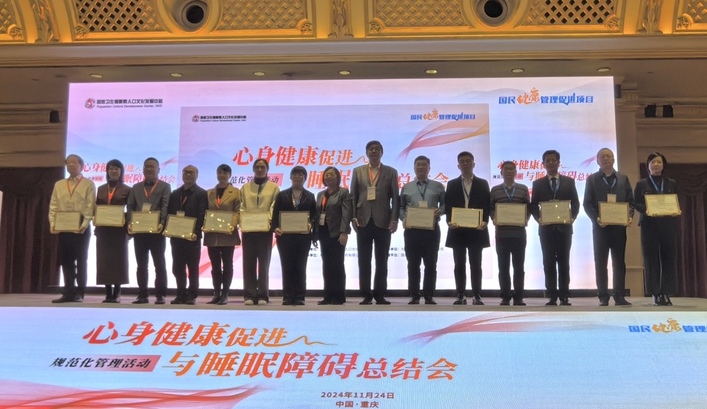 11月24日,同济大学附属同济医院在国家卫生健康委人口文化发展中心国民健康管理促进项目——慢病规范化防治优秀案例征集活动暨心身健康促进与睡眠障碍规范化管理活动中表现突出,荣获“防治经验科普推广单位”称号,位列全国100多家参评单位的第一位授牌。我院精神医学中心主任陆峥教授作为代表上台领奖,这一荣誉彰显了同济医院在规范化防治与管理经验推广中的领导地位,以及在保障人民群众健康方面的贡献。