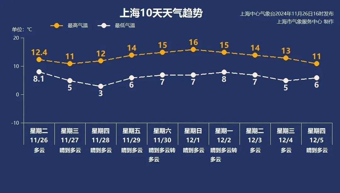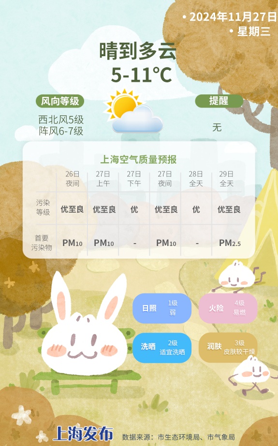 更冷了! 今天早晨市区最低气温5℃ 郊区2-3℃ 这还不是本轮寒潮的“底线” 明天早晨还会更冷! 今日天气 今天晴到多云,西北风5级阵风6~7级,早间叠加辐射降温影响,市区最低气温5℃,郊区2-3℃,一定要多穿一点,谨防感冒。预计白天最高气温11℃,体感偏冷。相对湿度80%~40%,火险等级气象指数:4级,易燃;空气干燥,注意补水保暖的同时,需要注意用电用火安全。 天气趋势 上海此次寒潮过程的最低温度将出现在周四早晨,最低气温市区 3℃,郊区 1℃左右,还请大家加强防寒保暖措施,易感人群注意多加防护,避免感冒等疾病的发生。未来十天多以晴朗干燥的天气为主,早晚偏冷,周五白天起气温开始缓慢回升,预计本周末及下周初的最高气温将升到15-16℃,适合安排洗洗晒晒。 此次寒潮影响过程中,东北、西北部分地区和华北北部等地将是全国最冷的地方,约10余省份最低温低于零下10℃。大城市中,哈尔滨、长春明晨最低气温会降至零下12℃左右,体验彻骨寒。