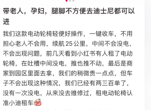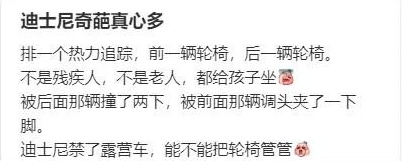 事实上,《上海迪士尼乐园游客须知》明确指出,游客可继续携带以下载具或车辆进入上海迪士尼度假区全域,包括了手推轮椅,不少于三个车轮且时速不超过16公里/小时的电动轮椅,但仅允许用于辅助因残障、高龄或有特定健康状况而行动不便的游客携带。