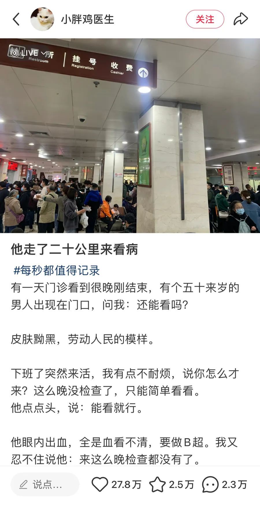 2023年,一篇名为《他走了二十公里来看病》的帖子在某社交媒体平台爆火,点赞超过27万,留言逾2万条。网友们纷纷表示,“看哭了,真的很温暖。”文章讲述了一位从家走了二十公里到县医院,又从县城赶到上海来看病的患者,医生在一天高强度的看诊后接诊了他,用最经济的方式治好了患者的故事。