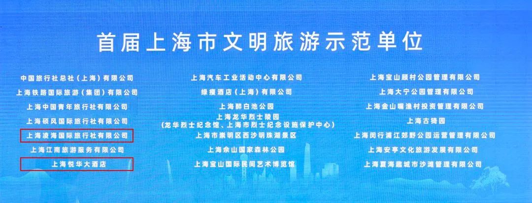 喜 报 11月22日,上海市文化和旅游局举办2024“文明旅游 魅力上海”文明旅游宣贯活动暨首届上海市文明旅游示范单位颁牌仪式,奉贤区两家旅游企业(上海悦华大酒店、上海凌海国际旅行社有限公司)荣获首届“上海市文明旅游示范单位”称号。 上海悦华大酒店 上海悦华大酒店作为奉贤区首批五星级酒店,连续20年荣获“上海市文明单位”称号,经营以来,一直致力于提升服务质量和宾客体验,多次荣获上海餐饮业绿色餐厅、爱国卫生合格单位、优秀工会组织等荣誉称号。 酒店占地1.67万平方米,建筑面积4.5万平方米,主楼高19层,是南桥标志性建筑之一,整体采用现代简约建筑风格,布局合理,功能完善。 多年来,上海悦华大酒店持续实施多项措施推进文明旅游,包括强化宣传引导、开展员工培训、优化服务流程,规范服务礼仪等。同时,酒店还提供一站式服务满足宾客需求,提升宾客满意度,引领奉贤酒店行业文明旅游建设。 凌海国际旅行社 上海凌海国际旅行社有限公司成立于2004年7月1日,是一家拥有国内、出境、入境旅游资质的4A级旅行社,多次荣获“上海市守合同重信用企业”“奉贤区文明单位”等荣誉称号。 多年来,旅行社一直以品质旅游、高端服务受市场认可。旅行社通过宣传引导、开展员工培训、与供应商签订文明旅游公约、设立文明旅游激励机制等形式,引导员工、游客及供应商遵守文明公约,被上海市总工会评为上海市职工“看上海、品上海、爱上海”推荐旅行社之一。 未来,凌海国旅还将继续推进文明旅游,打造绿色旅游环境,不断提升游客的幸福感满意度。 首届上海市文明旅游示范单位,是根据相关国家行业标准(LB/T075-2019),经过严格评审后选出的一批高水平行业标杆单位,是上海旅游业一道靓丽的“风景线”。 下一步,奉贤区文化和旅游局将持续开展行业指导,通过建立导向、树立标杆,引领和带动更多行业企业创先争优,为奉贤文旅行业的高质量发展持续注入新活力新动能。