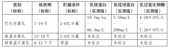 巴氏杀菌乳中标有乳铁蛋白的产品均含有乳铁蛋白,未标示乳铁蛋白的也含有乳铁蛋白,而高温杀菌乳和超高温灭菌乳中均未检出乳铁蛋白。
